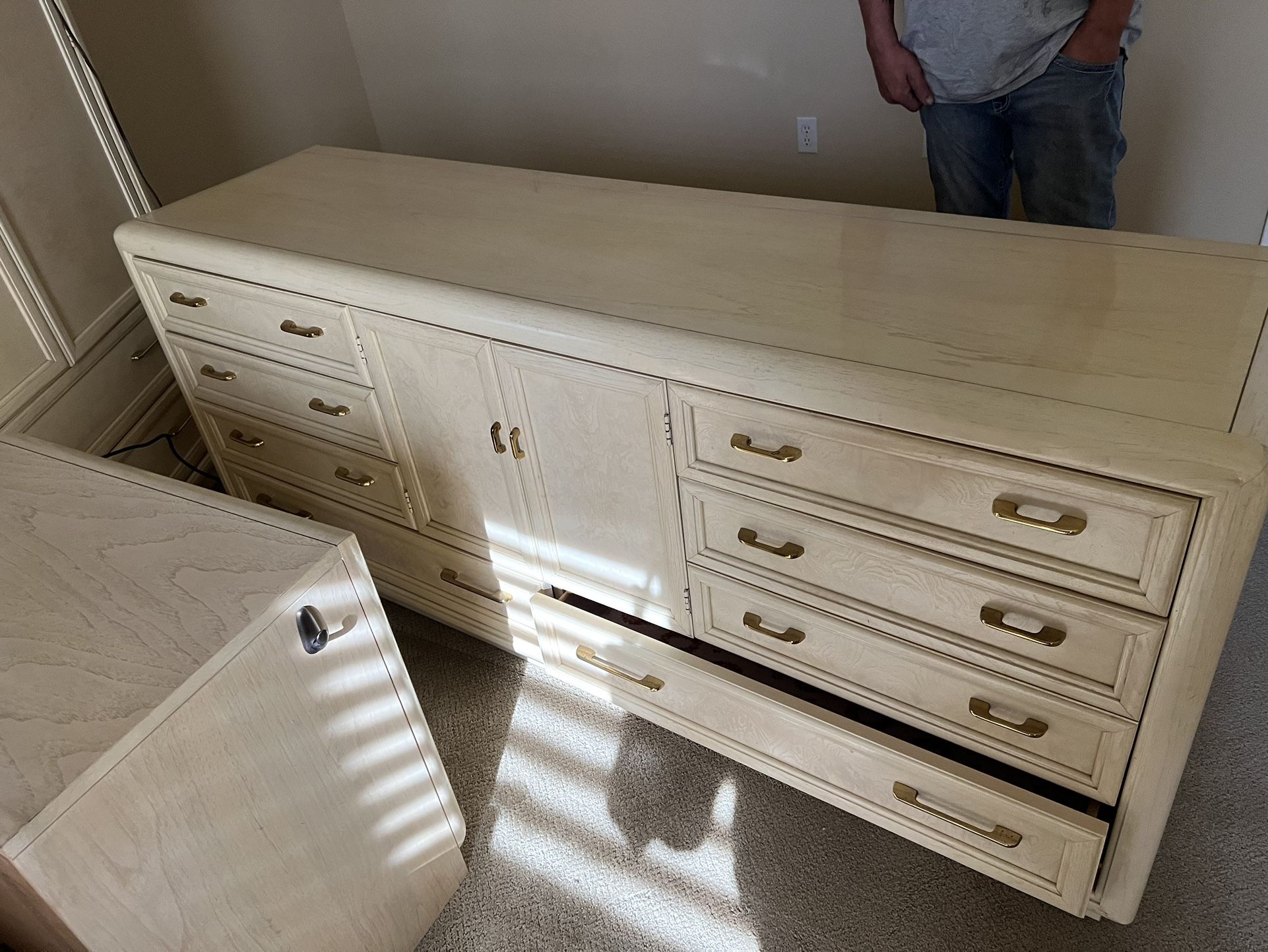 Head board with drawer storage space Tall standup clothing dresser that opens up on top with drawers on the bottle two night stands And one six footer long dresser vanity with mirror attached Like new no dents or marks Clean and ready to go ! Valued when bought for 5500$ I’m selling it all for 800