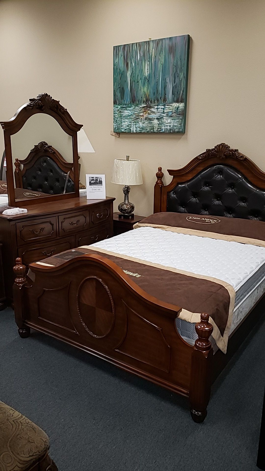 Queen bed frame only + night stand + dresser mirror no mattress so please don't ask about that