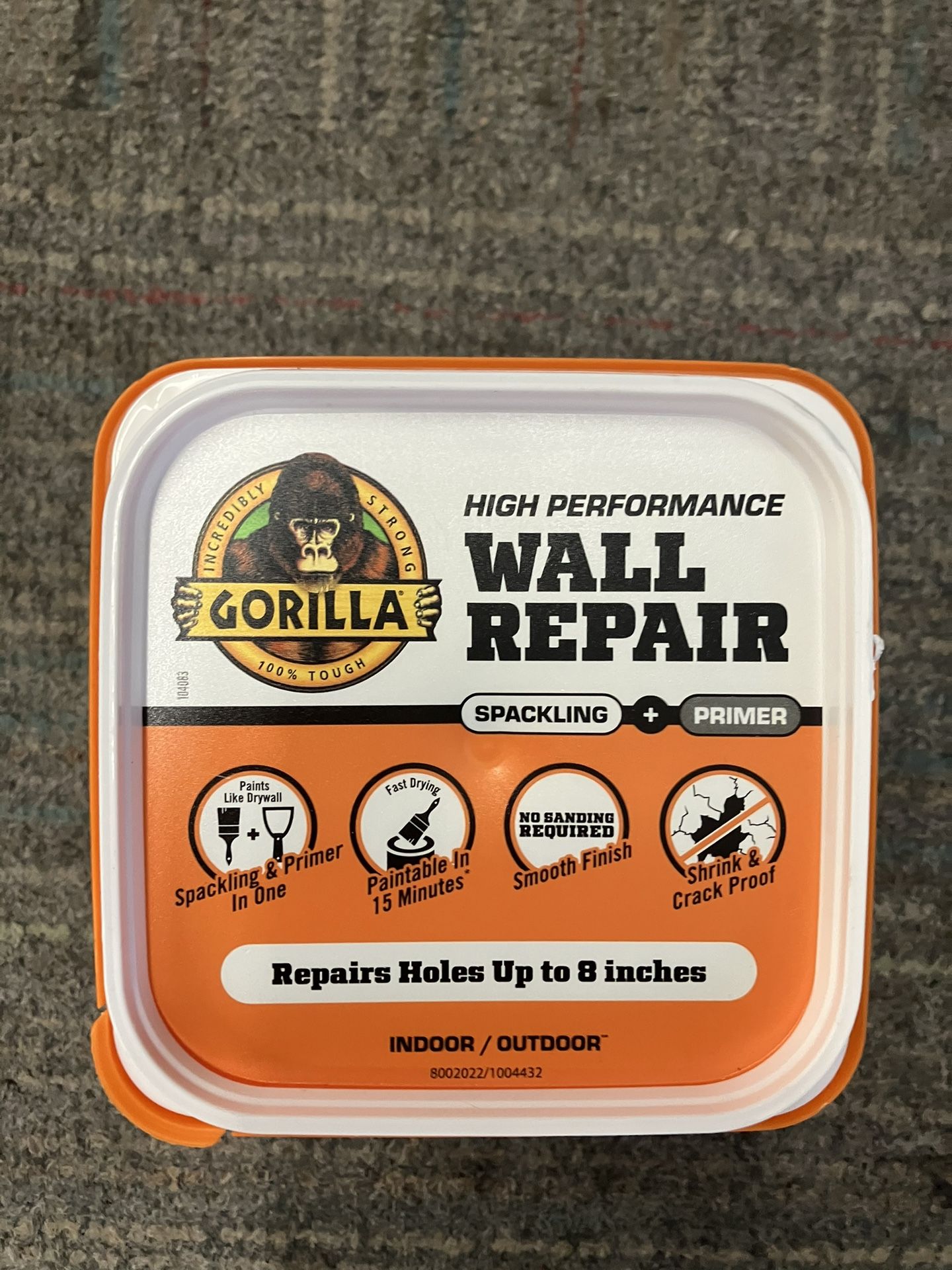 Wall Repair Spackling and Primer 16oz pack of 1. Color: White Assembled Product , New Robust Repair: Gorilla Glue Wall Repair offers strong and durable solutions for walls, ceilings, and holes, suitable for both indoor and outdoor applications. • Integrated Formula: This product functions as both a spackling compound and a primer, allowing it to be painted like drywall for a seamless finish. • Durable Finish: The formula is designed to be shrink and crack proof, ensuring long-lasting repairs without deterioration. • Rapid Drying: It is fast-drying, becoming paintable within 15 minutes of application, facilitating quick project completion. Effortless Application: Featuring a lightweight, no- sag formula, it is easy to spread and provides a smooth finish that typically does not require sanding. • Convenient Packaging: The product comes in a 16oz pack with a tight-lock container, promoting a long shelf life and reusability.