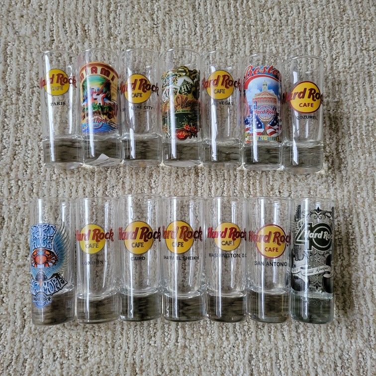 14 Hard Rock Cafe double shot glasses. Paris Miami Salt Lake City Las Vegas Las Vegas Boston Cozumel Baltimore London Cairo Sharm El Sheikh Washington DC San Antonio Denver