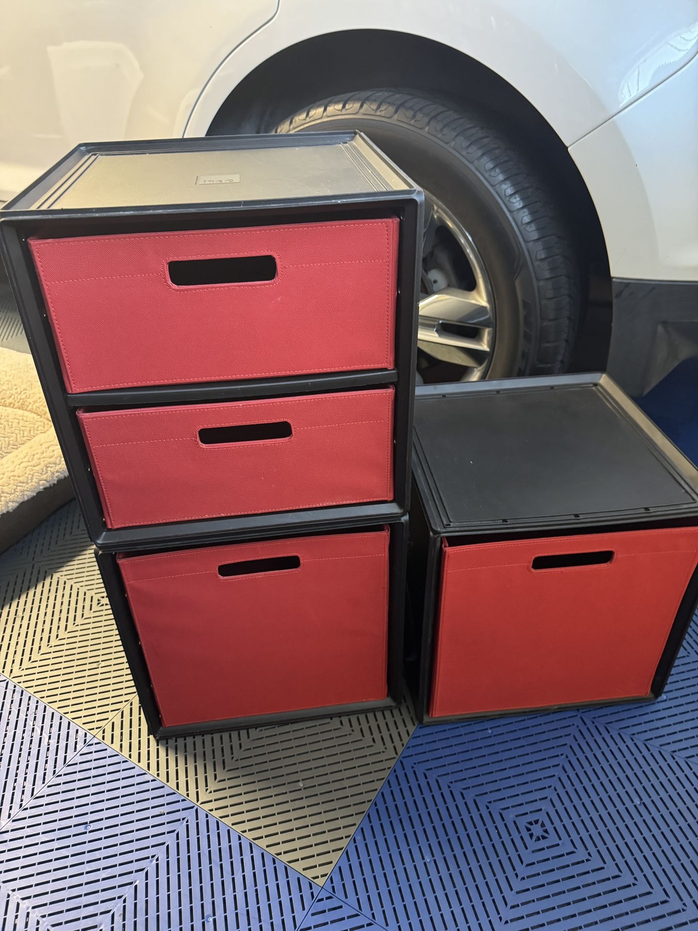 3 storage bins with red fabric drawers. 14 1/2 square Located in South Temecula. 1 mile from Redhawk golf course.