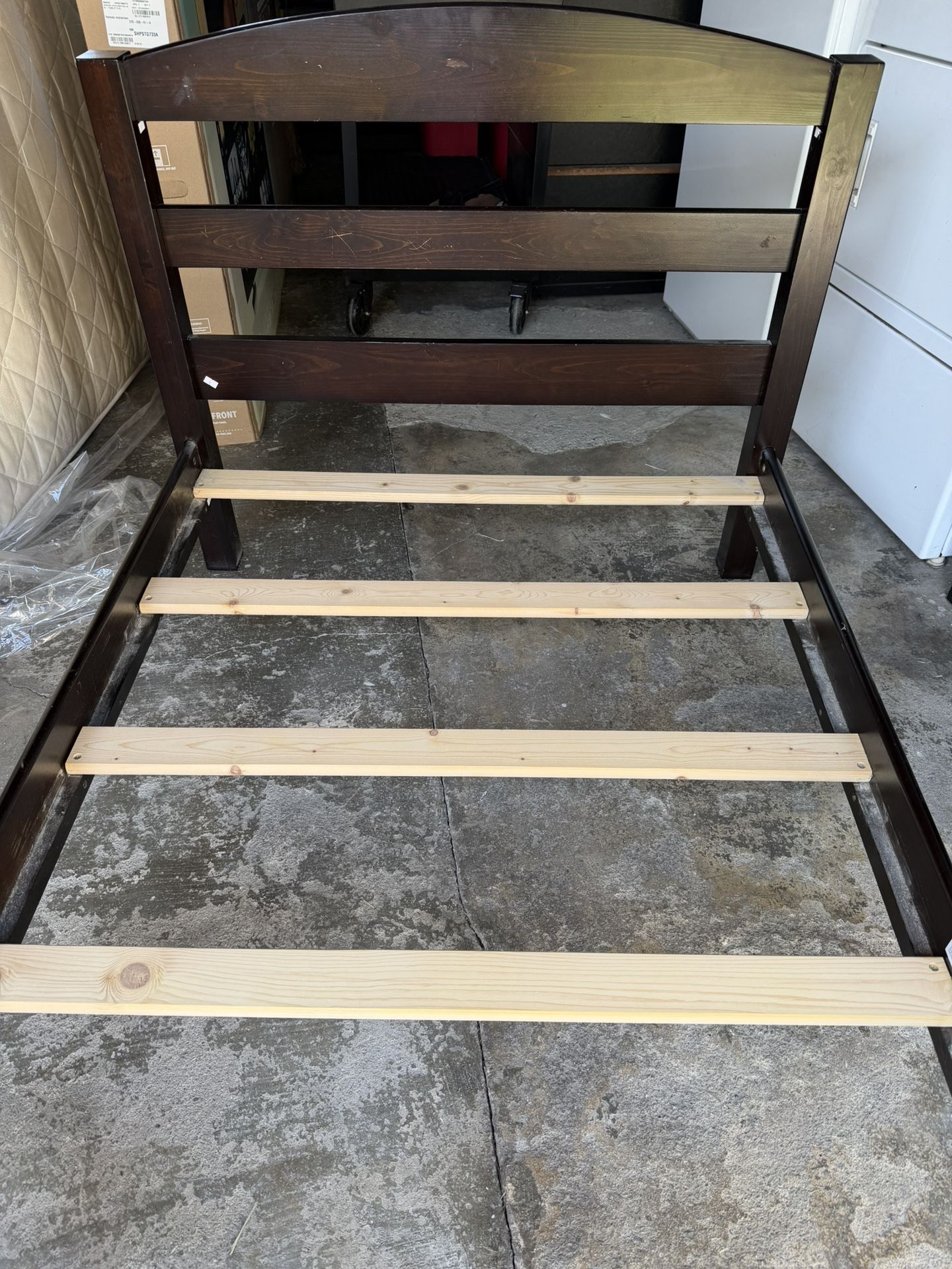 “Espresso” Dark wood twin bed frame .MATTRESS included (if wanted). Great condition and good quality. Bed includes arched open slat headboard, footboard, side rails, and slats Simple sturdy wood construction for durability 4 solid block legs provide stability and support.