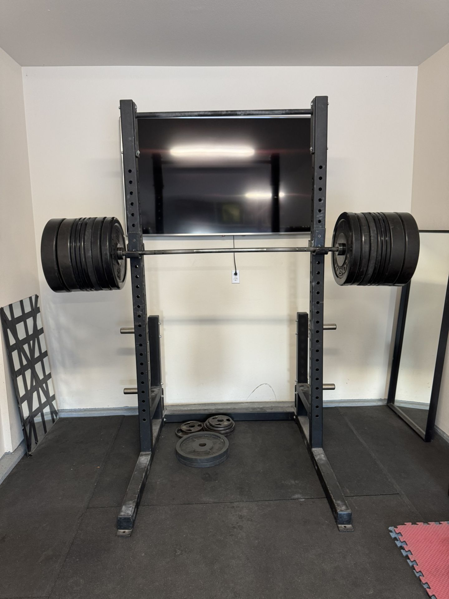 PL7353 Deluxe Squat Rack Commercial Grade 3" X 3" tubing, 11 gauge steel 93" Height, 53.5" X 48" foot print 1.25" diameter pull up bar 2 Bar Holders 4 Chrome Weight Storage J-Hooks Weight: 257lbs Weight Capacity: 1000lbs WEIGHTS AND BARBELL NOT INCLUDED!