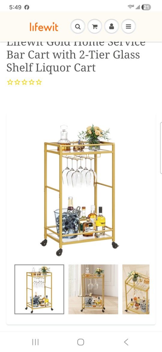 Lifewit Bar Cart, Home Serving Cart with 2 Tier Glass Shelves, Liguor Rolling Cart with Lockable Wheels, Glass Holder and Wine Rack, Beverage Cart for Kitchen Dining Livina Room. Gold