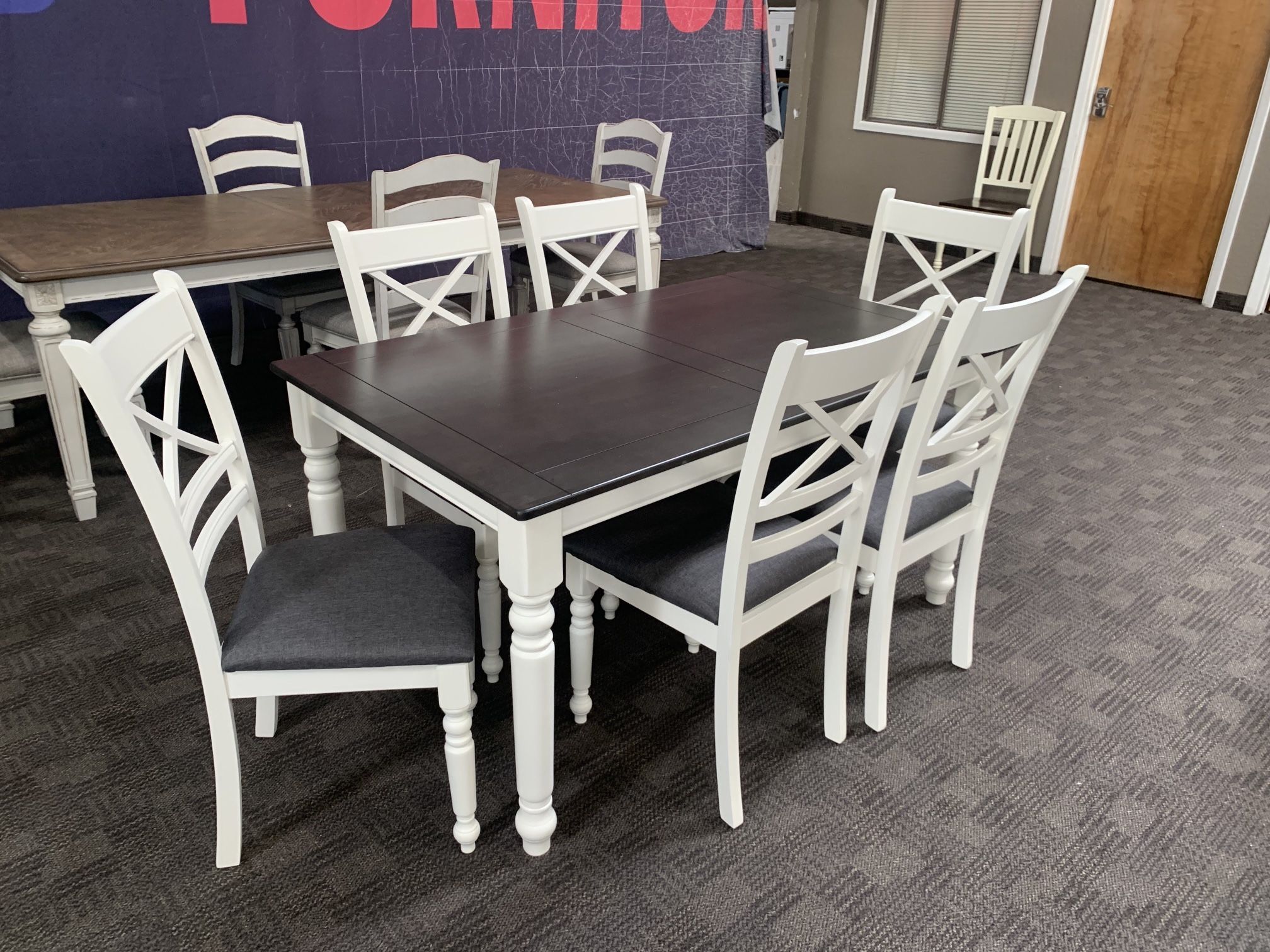 Brand new white farmhouse dining set! Kitchen table has Grey top and grey upholstered seats on the 6 chairs. Measures 60” by 36” Delivery and payment plans available