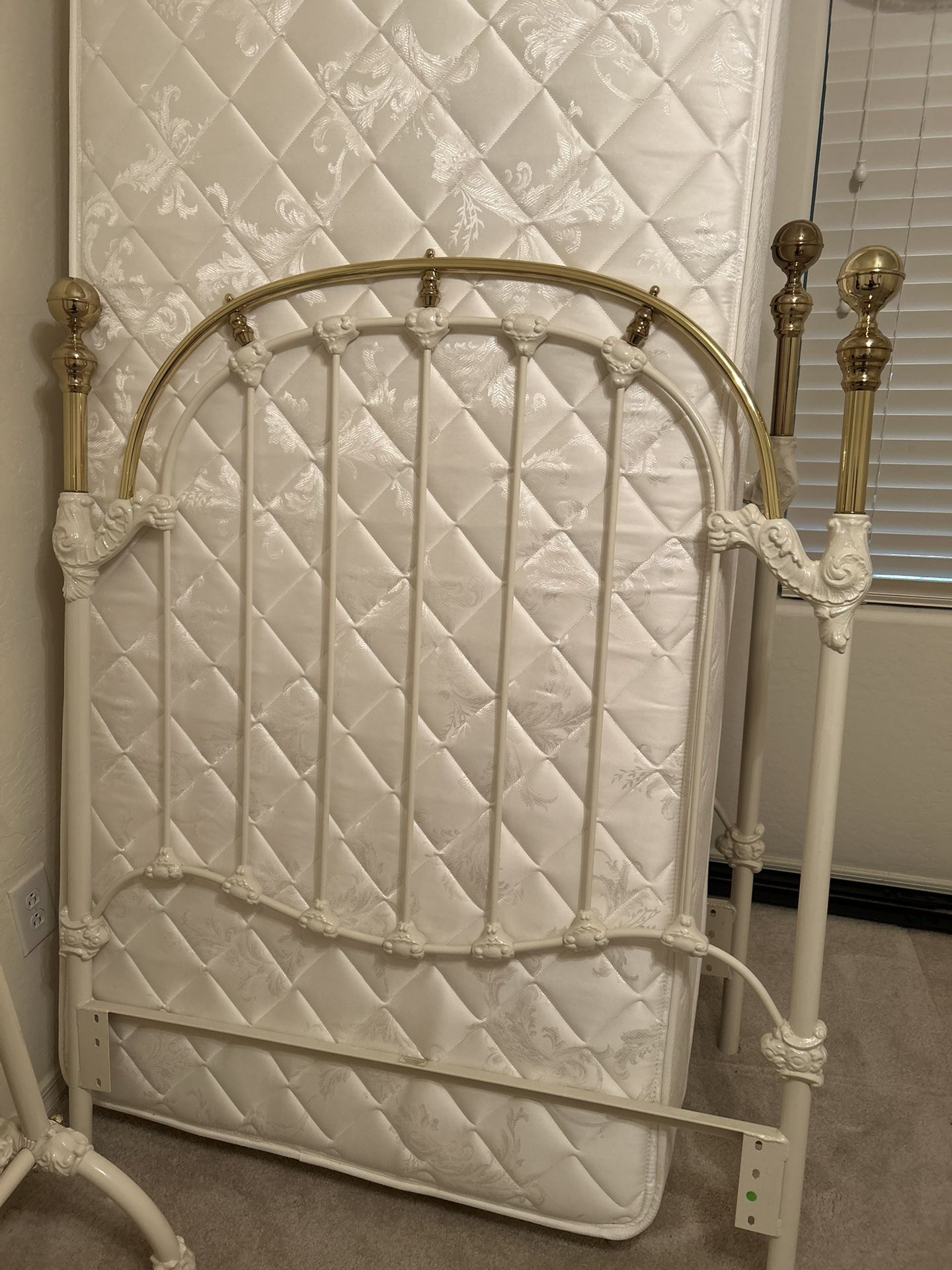 2 White Wrought Iron TWIN Beds ($100 each) In rarely used (maybe 2X in 20 years) guest room. Frames, Mattresses, Box Springs like new. All Bedding like new and includes sheets, pillow cases, pillows, and mattress pads for both beds available for additional purchase. NONSMOKING HOUSEHOLD NO PETS IN HOME CASH ONLY PLEASE 💰