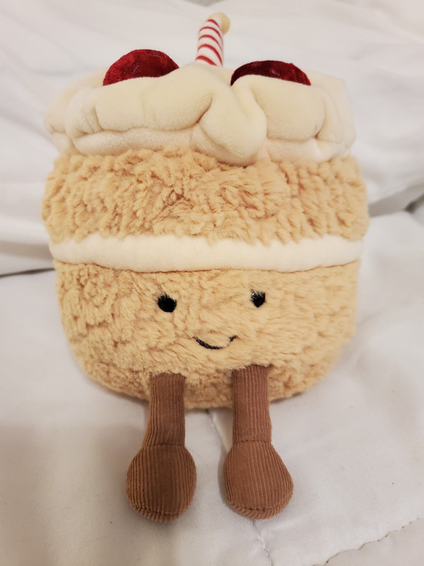 The Jellycat Amuseables Birthday Cake Stuffed Toy is a 6-inch dessert plush perfect for celebrating special birthdays. With its cute design and high-quality materials sourced from Vietnam, this small-sized plush toy is recommended for children aged 3 and up. The toy belongs to the Jellycat Amuseables Cherries character family and is ideal for various age ranges, making it a versatile and adorable gift for kids of all ages. Jellycat Amuseables Birthday Cake plush toy. Design: A fluffy cake character featuring corduroy legs, a striped candle, and decorative frosting with strawberries. Dimensions: It measures approximately \(6.25\times 4.75\times 4.75\) inches. Material: Made from a soft blend of polyester and cotton. Features: Suitable from birth and tested to meet European Safety Standards for toys.