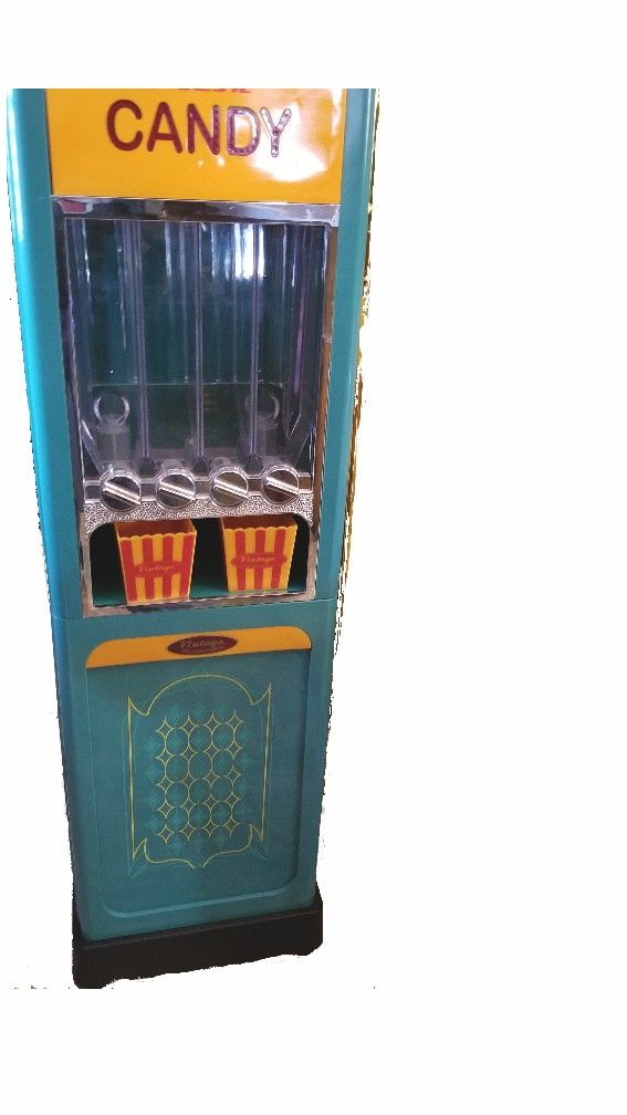 Description: Hard-to-find retro candy dispenser machine by Vintage Appliance Co. with a classic movie theater candy stand look. This piece is both functional and decorative. ✨ Lights up with built-in electrical cord, giving it a great vintage display glow. Features: • 4 candy dispensing slots with turn knobs • Clear candy tubes to showcase candy • Bright retro turquoise and yellow design • Includes original-style candy boxes • Lighted display with power cord • Great for game rooms, kitchens, shops, or collectors This is a fantastic conversation piece and a fun way to display and dispense candy. Condition: Good condition and clean. See photos for details. 📍 Pickup: Wichita Falls area 🚚 Delivery available to the DFW area for an additional fee Message if interested or if you'd like additional photos.