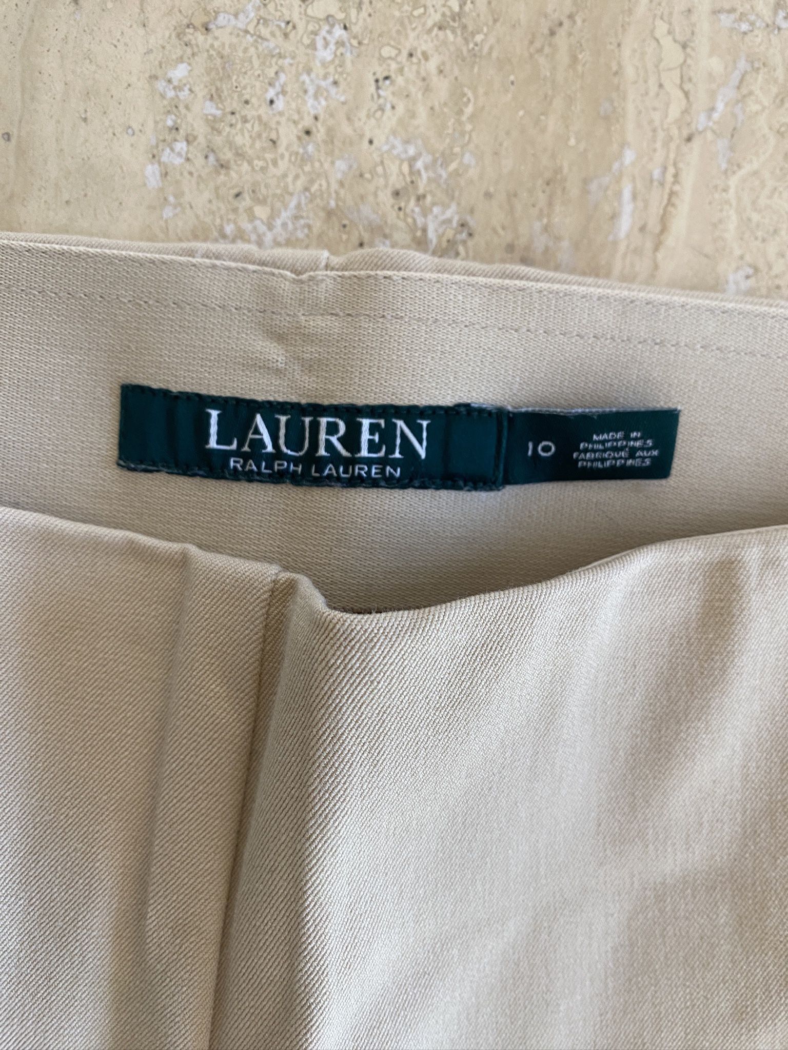 Lauren kaki pants with side zipper. Size 10. Very stretchy and comfortable. High waist. Worn only a few times. Excellent condition. Dry Clean. Measurements (also see photos with tape measure): Length from waist to bottom 37.5” Inseam 27” Waist 16”