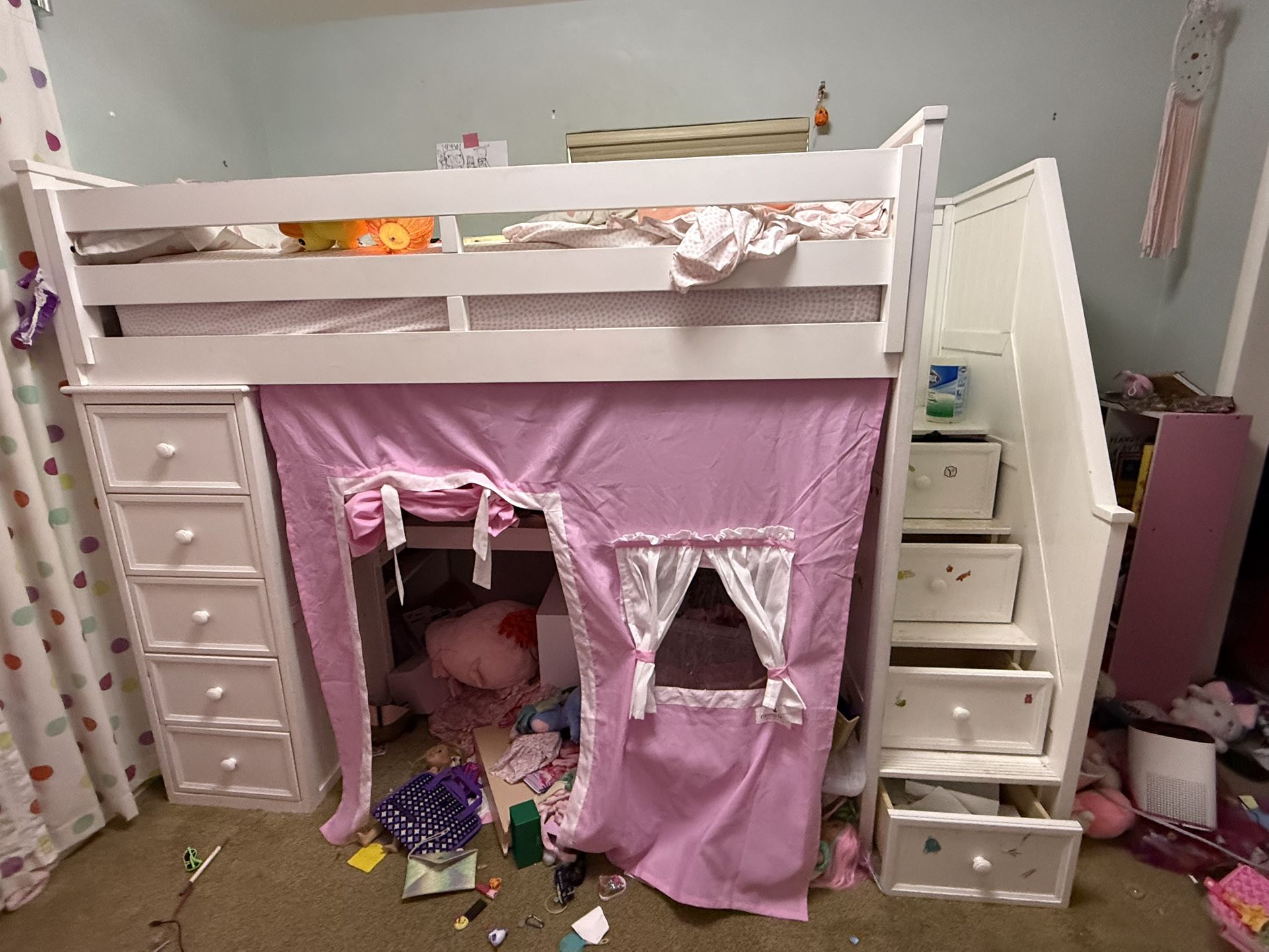 Originally $2800 from local furniture store. Twin size bed. Stairs with drawers for storage. A desk as well as an open sided bookshelf. We love this bed. It’s still in great condition. Partially disassembled for easier transportation & easier assembly. Must pick up. Curtain shown in pictures to hide under bed desk area is included. Attaches via Velcro. It’s 101” width, 43” deep & 69” height