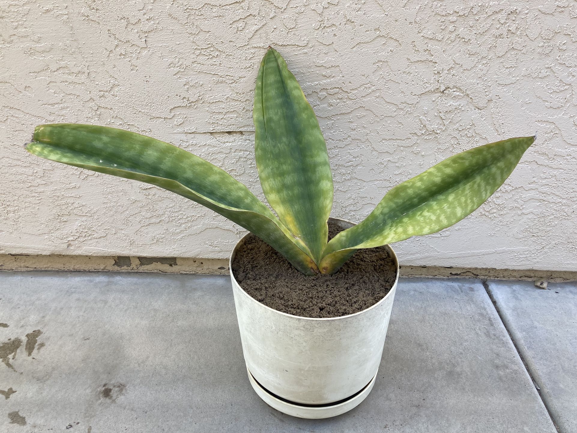 Absolutely enormous whale fin snake plant (Dracaena masoniana, formerly Sansevieria masoniana) plant in large vintage planter with attached saucer. Planter is 12” diameter and very durable despite its age. Plant is a bit under 3’ across with leaves roughly 1,5-2’ long. Recently-ish repotted after it bloomed last fall, and it has a baby under the surface that should emerge in the near future. Leaves are slightly yellow, likely due to the energy used up during flowering and then the slew of cold wet weather we had over the holidays. I checked over the roots during reporting and they looked great, so it should green up with a bit of fertilizer and warmth. Planted in cactus/succulent soil with decomposed granite top dressing. Love this plant but it’s just gotten too large (the flower stalk caused the leaves to splay out more). I need to clean out the garden/patio for spring, but this is just in the way. Priced low for a quick sale so I can reclaim the space! This variety is one of the more rare varieties of snake plants and very hard to find one this size!