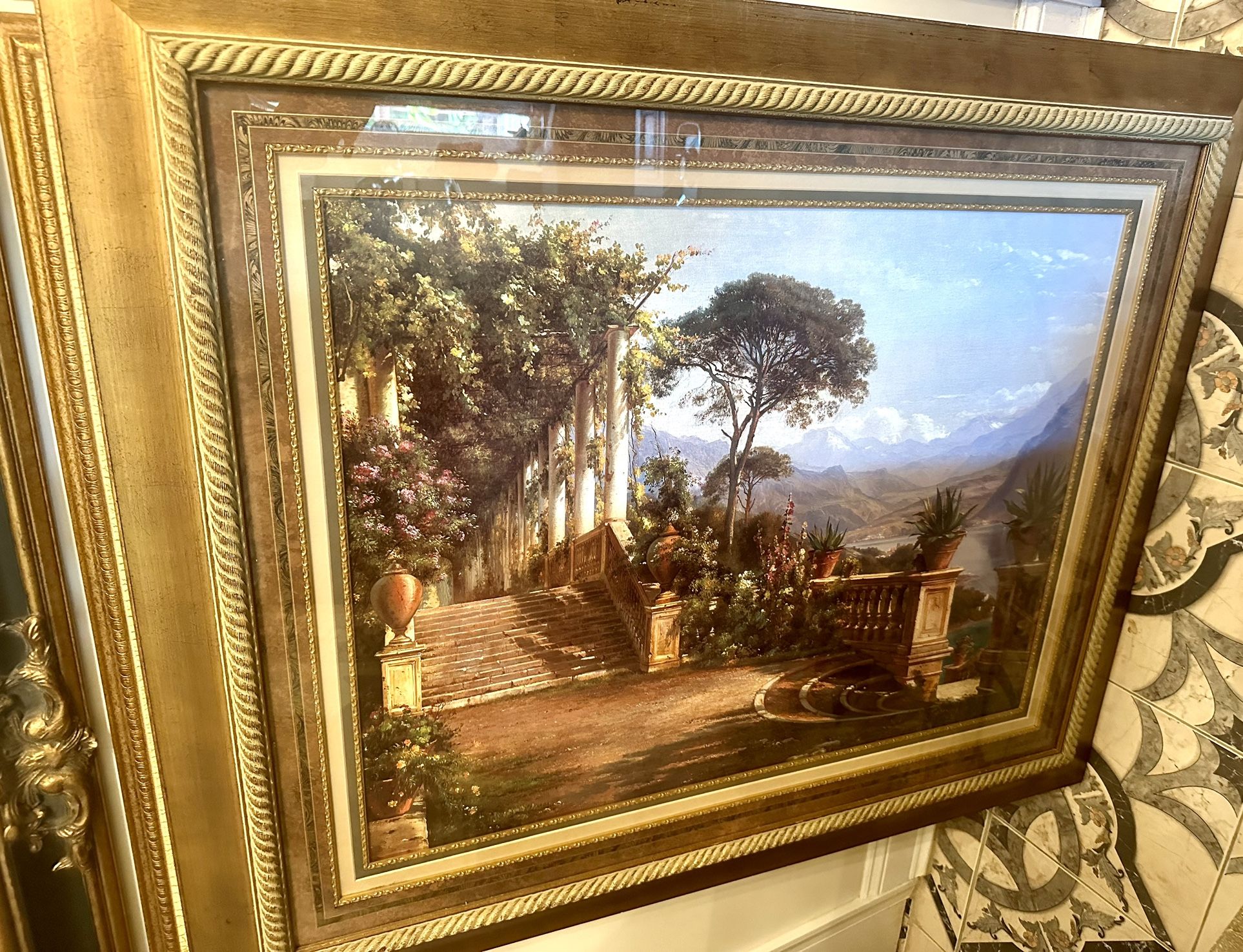 Stunning Classic Landscape Artwork in Ornate Frame Elevate your home decor with this beautiful classic landscape picture, expertly framed in a luxurious ornate frame. The intricate details and golden accents of the frame perfectly complement the serene and timeless landscape artwork, creating a truly stunning piece that will be the focal point of any room. Details: · Classic landscape artwork featuring a serene natural scene · Ornate frame with intricate details and golden accents · Frame size: 38” x 47” · Ready to hang and enjoy! Add a touch of elegance to your home with this beautiful artwork. Contact us to learn more and make an offer!