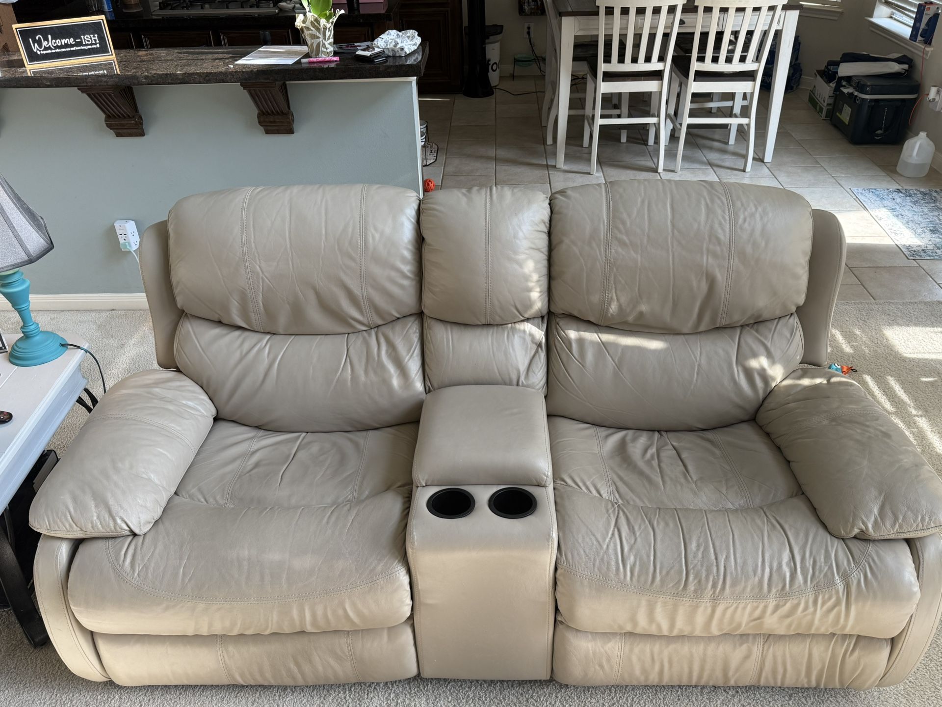Leather living room set for sale. Normal wear & tear for a house with pets. Reclines on each end of the couch, both seats on the love seat and recliner (not pictured but can take if asked). Love seat reclining mechanism on the side, lost the round piece. Love seat has center console with charging ports and two cup holders.