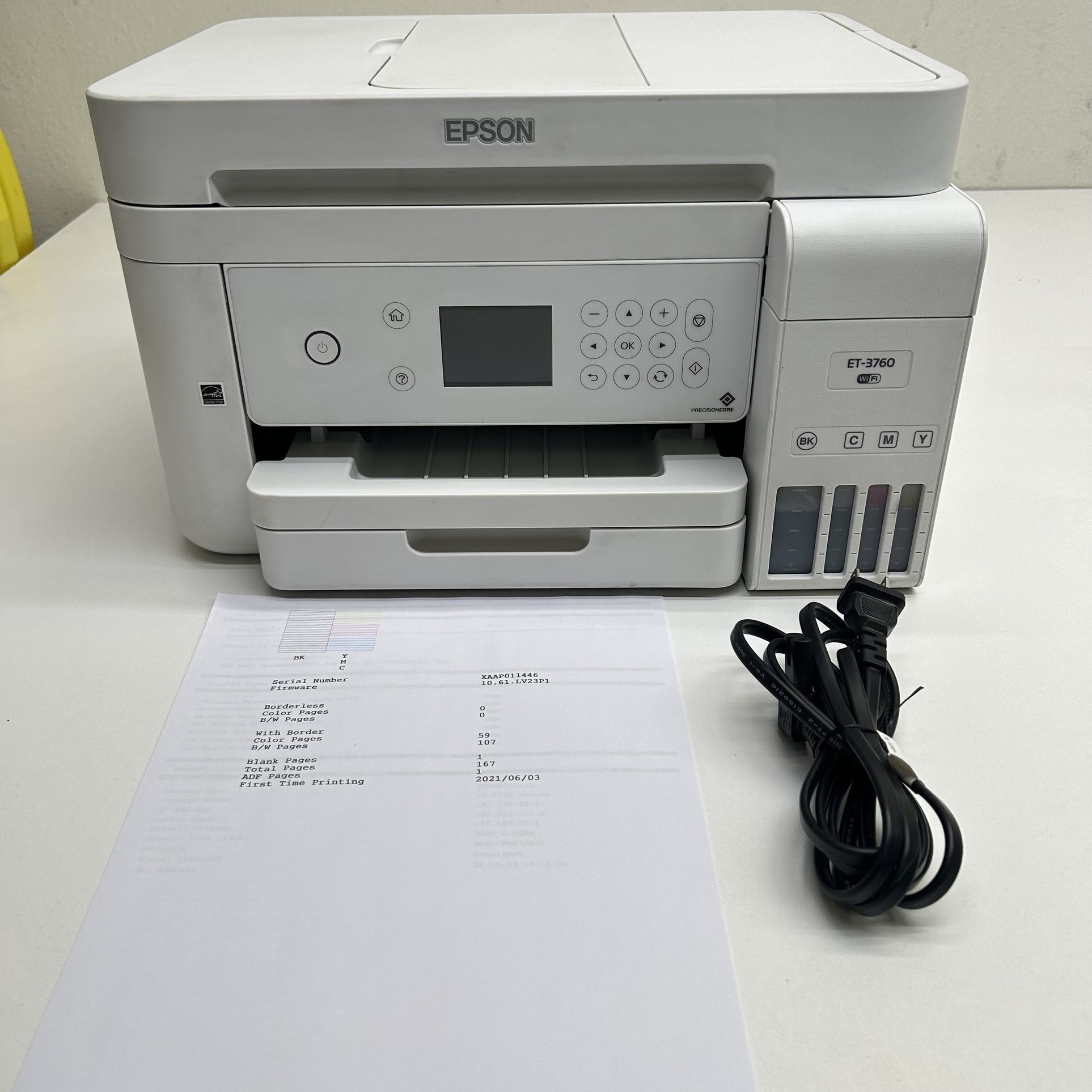 Epson EcoTank ET-3760 – All-in-One Color Printer ✅ Tested and fully working via Wireless and USB ✅ Page counter: Approx. 150–250 pages ✅ Ink tank pre-filled to 75% with regular ink ✅ No extra ink bottles included ✅ Maintenance Box reset Includes: Epson ET-3760 Printer Power cord No clogs