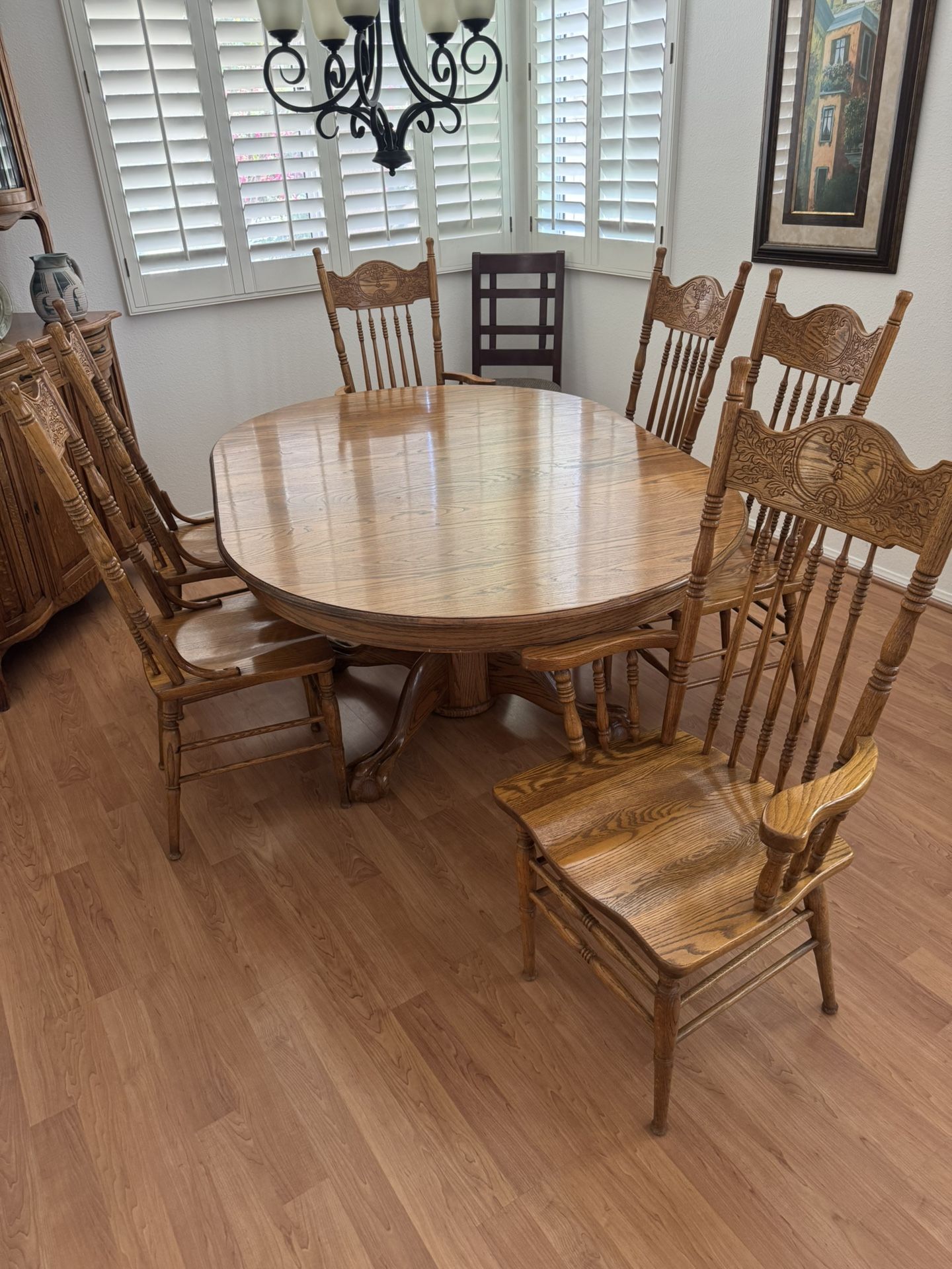 This is a beautiful Oak dining table with ornately carved chairs. In nearly perfect condition, this piece will brighten up any room!