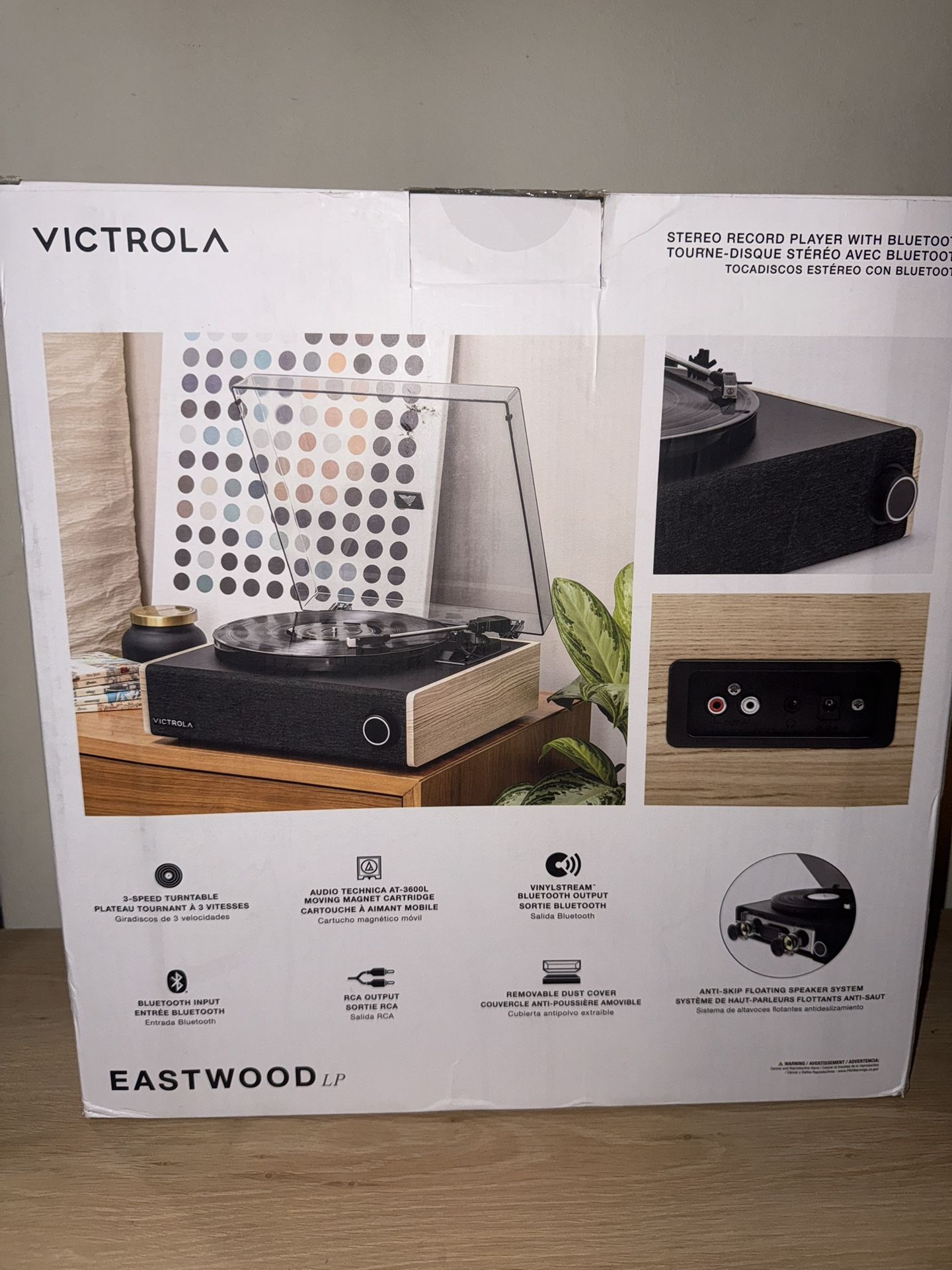 *Brand New* Features 3 speed turntable features Anti-skip floating speaker system providing room-filling stereo sound and enhanced bass while preventing unwanted vibrations and skipping Scratch-Free Isolated platter and tonearm design provides an extra layer of vibration prevention to keep your records scratch-free and playing loudly VINYLSTREAMTM Bluetooth output enables wireless streaming to Bluetooth speakers and headphones Audio Technica AT-3600L moving magnet cartridge delivers exceptional audio quality, enhancing the clarity and richness of your music Bluetooth connectivity for streaming music from any Bluetooth-enabled device to the integrated stereo speakers What's Included Eastwood LP Stereo Bluetooth Record Player with Bluetooth and 3 speed Turntable
