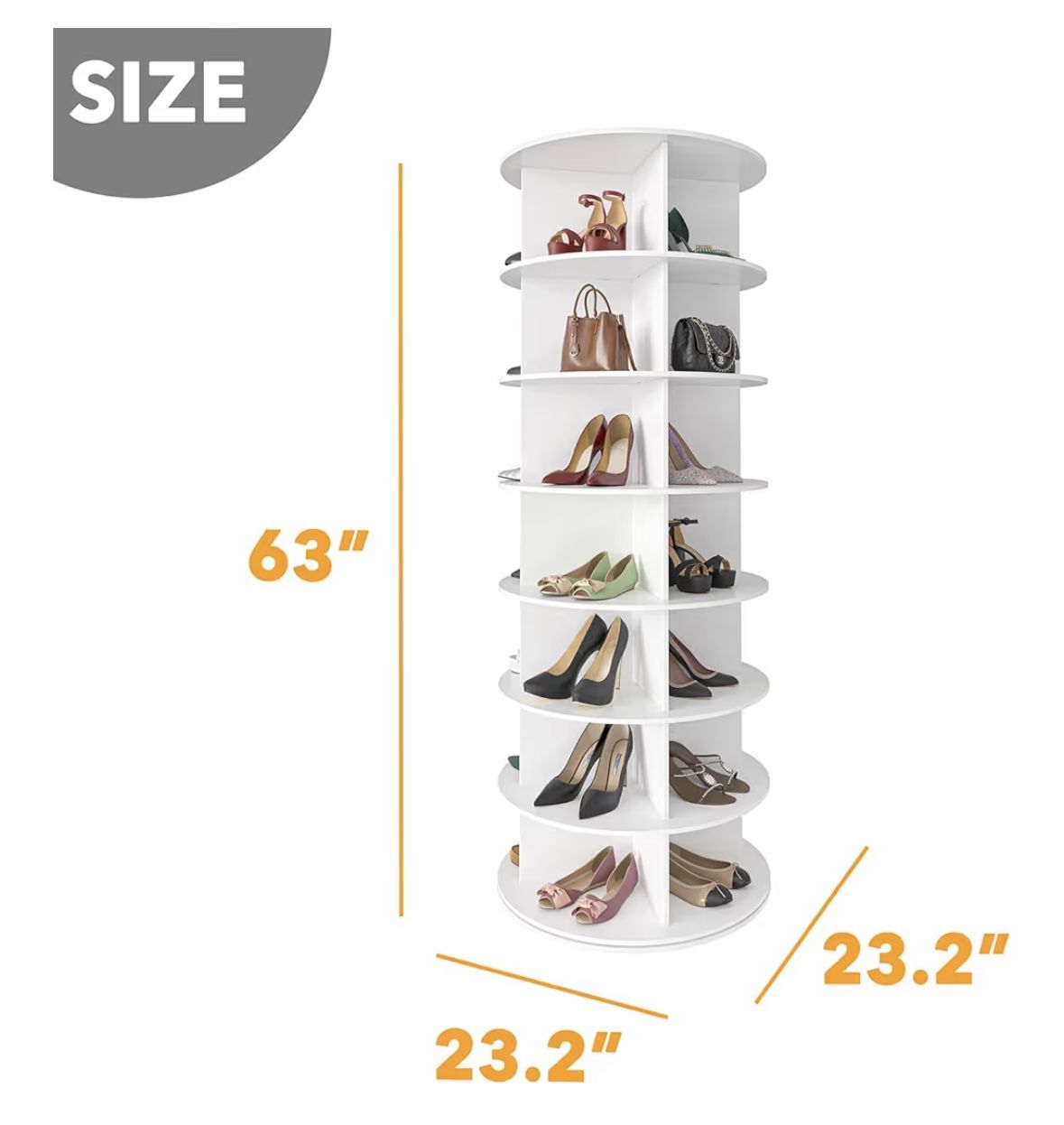 New in box. 7-Tier Rotating shoe or purse organizer The space saving design can hold up many shoes or bags in a compact space SIZE: 23.2"W x 23.2"D x 63"H Can be in the closet or any space Bought for $120.