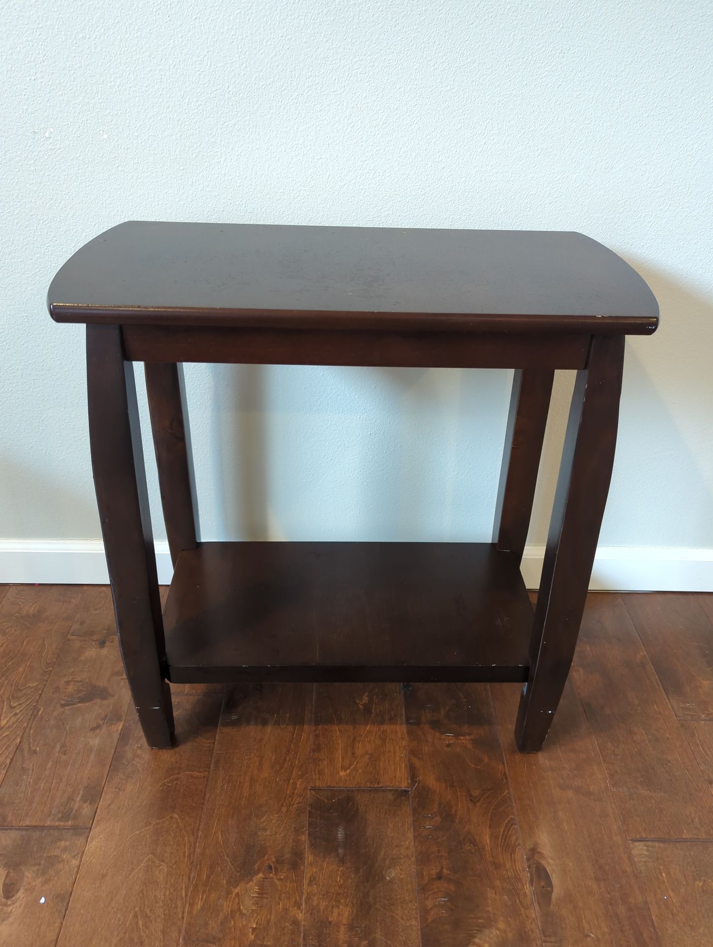 It features a minimalist, transitional design characterized by slightly bowed, tapered legs and a deep cappuccino finish. Height- 2 ft Width- 2 ft Depth- 1 ft