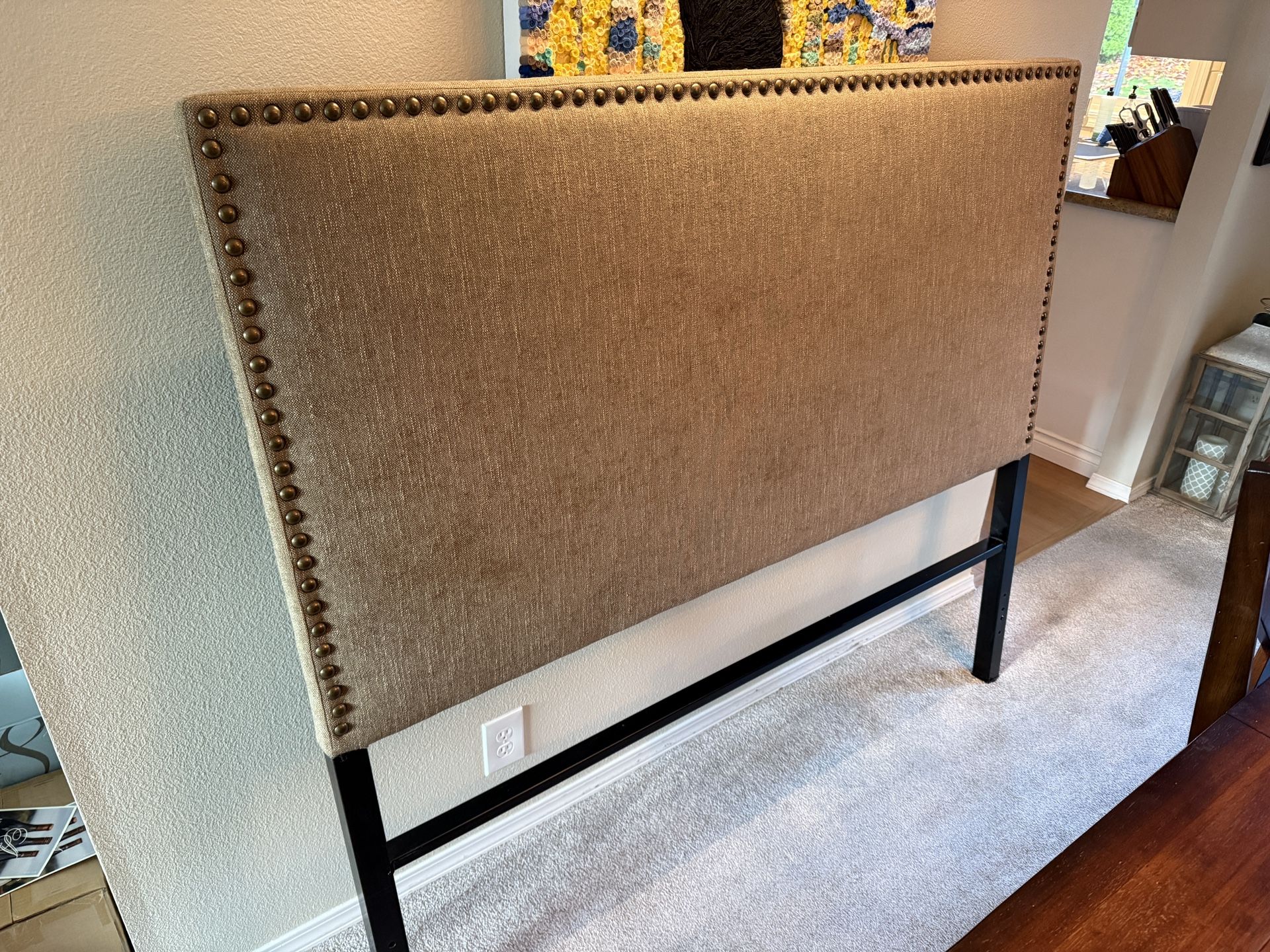 Queen headboard in excellent condition. Bought from PierOne Imports. 61” wide x 54” tall x 2.5” thick. There are holes drilled into the metal legs, assume you can attach to a metal queen bed frame.