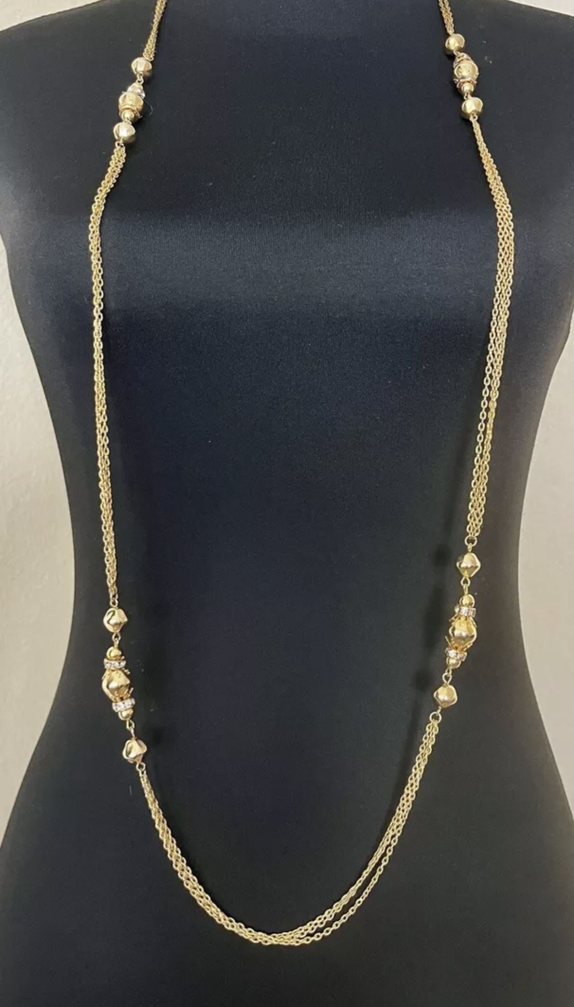 Vintage Véndome glamorous designer necklace. Beautiful condition! 3 gold-tone textured metal chains with crystal rhinestones surrounding 6 decor gold tone metal beads. Rhinestone crystals are clear & dark blue/black. Unsure if the blue/black are intentional-they are gorgeous & add to the vintage beauty of the necklace. At 48” long there are so many ways to wear this versatile piece. As one long necklace, or stackable. Perfect for any occasion-everyday wear or special occasions. Classic timeless design & style.