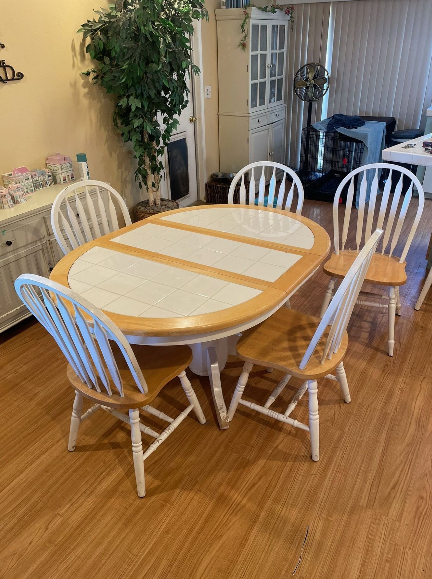 White/Maple Lighted Hutch, Table with 5 chairs, 2 Bar Stools Hutch is 78” tall, 50” by wide, 16” deep 2 sections Glass shelves TABLE: 58” x 42” (including removable leaf) STOOLS: Seat Height 30” Some scratches/scrapes on the table and chair legs
