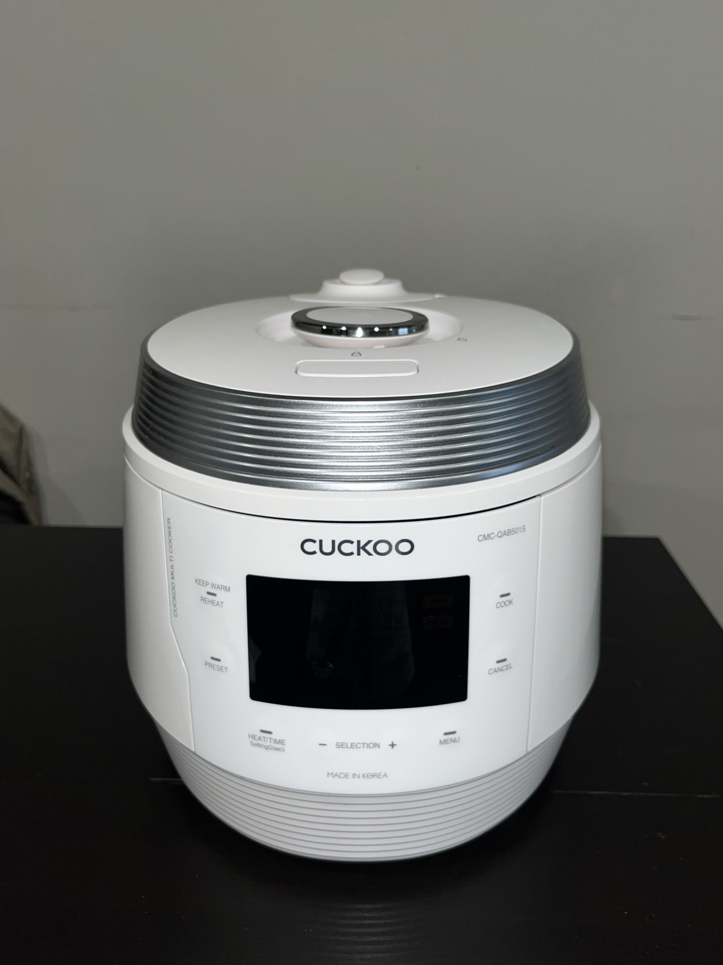 Cooks great rice and large portions. I’m downsizing to a smaller one since I don’t cook as much anymore. - Lightly used for about 1 year - Only used for cooking rice - Clean, well-maintained, and fully functional - Stainless steel pot - Voice enhanced navigation - Auto clean feature - 10 different settings/programs Cuckoo 5 Quart 8-in-1 Multi-Pressure Cooker CMC-QAB501S
