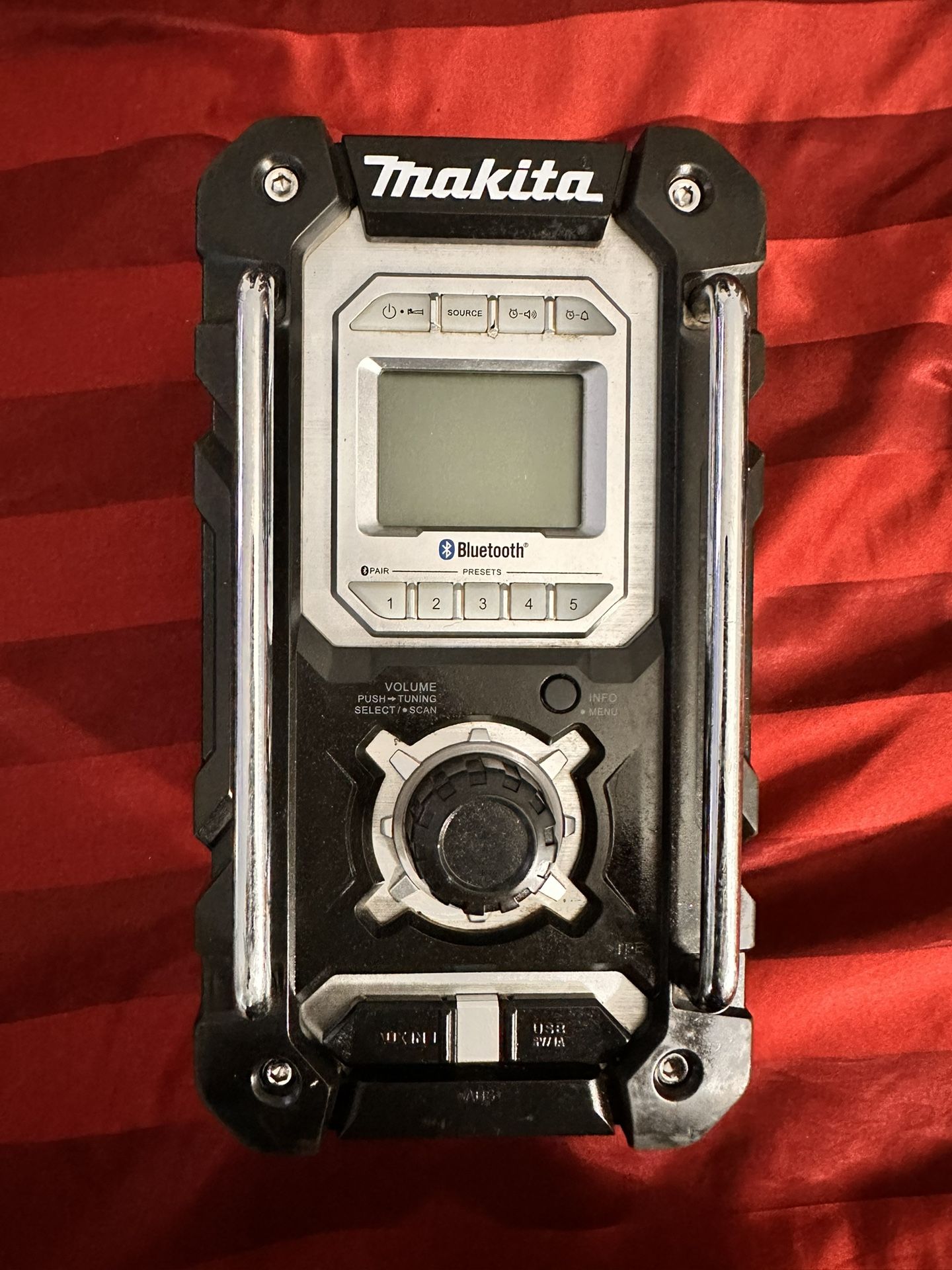 The product is a Makita Cordless Bluetooth Job Site Radio. It is compatible with Makita 18V LXT and 12V max CXT Lithium-Ion batteries. It features Bluetooth technology to wirelessly connect to a mobile device. The radio has a dust and water-resistant construction (IP64 rated) and protective bumpers for durability. It includes a USB port for charging mobile devices and an AUX port for MP3 players.