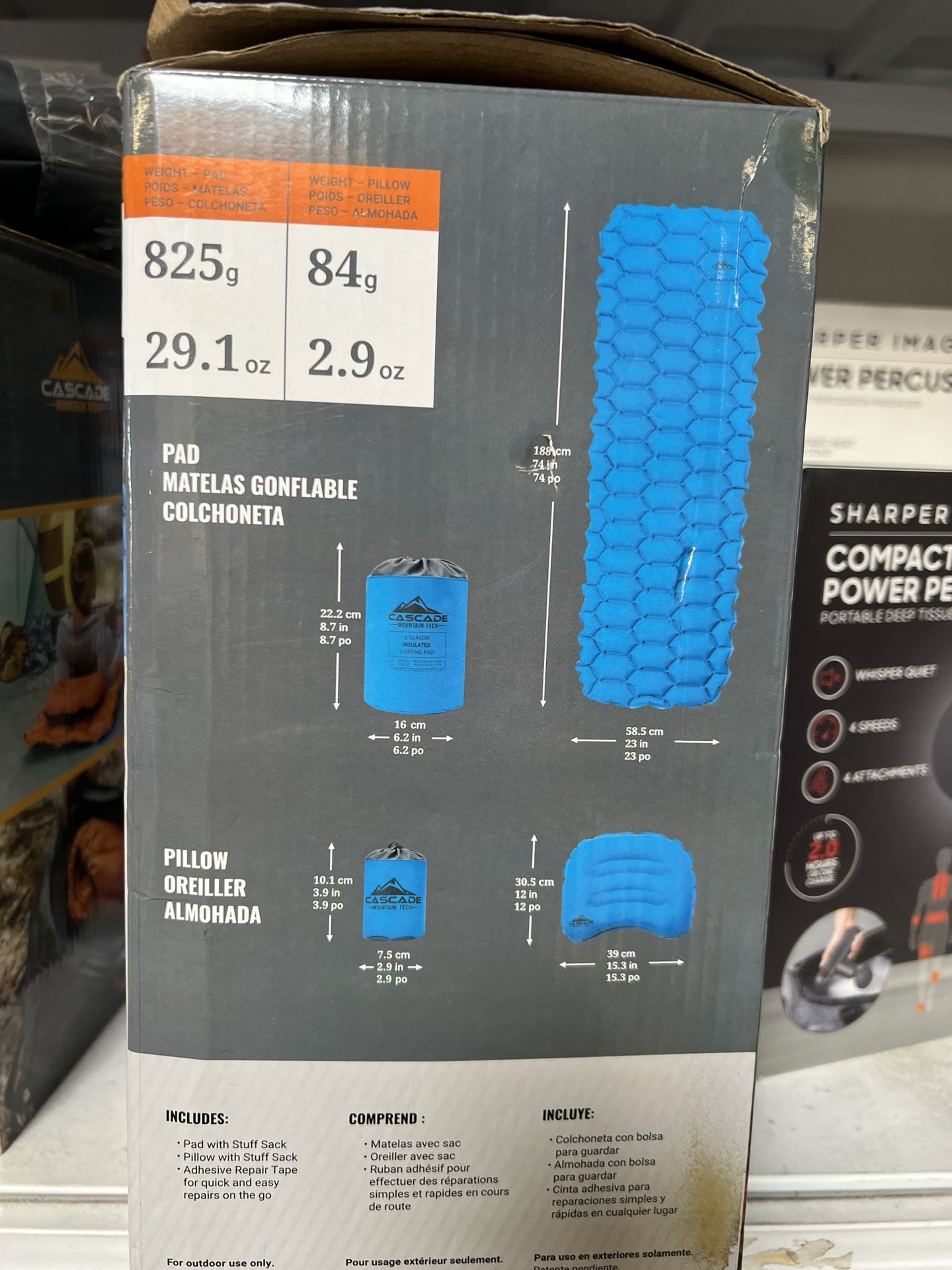 Comfortably sleeps users up to 6 feet tall Lightweight: 29 oz Inflated: 3" thick 3-Seasons: Spring, Summer, Fall 2-Way Valve: For fast inflation & deflation Material: Rugged and durable ripstop polyester Water-resistant coating 100% polyester insulation Includes Premium Inflatable Camping Pillow