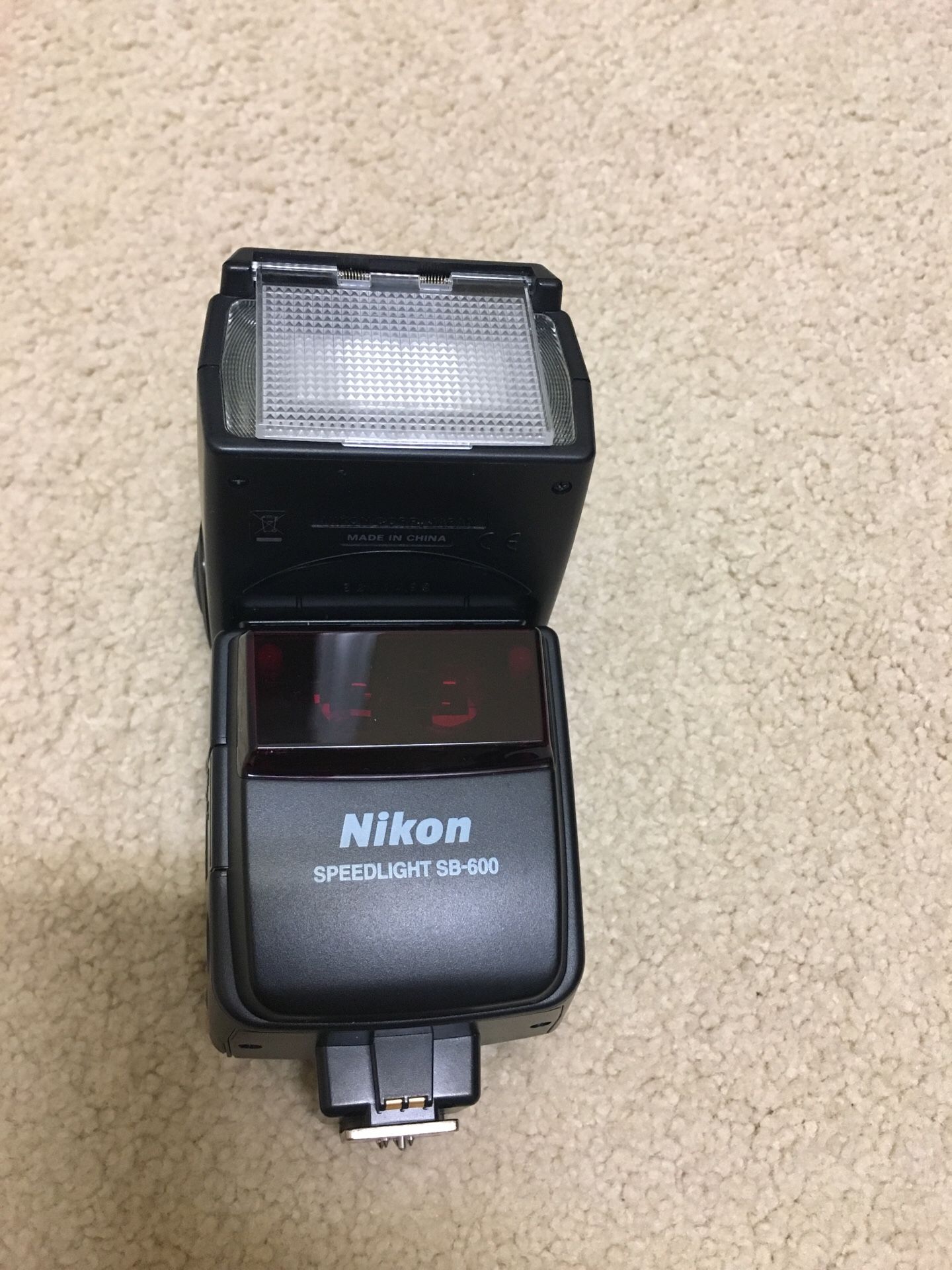 Speedlight SB 600 flash. Excellent condition. Barely used. Also included are 2 sets of Duracell rechargeable batteries (4 per set) and battery charger.