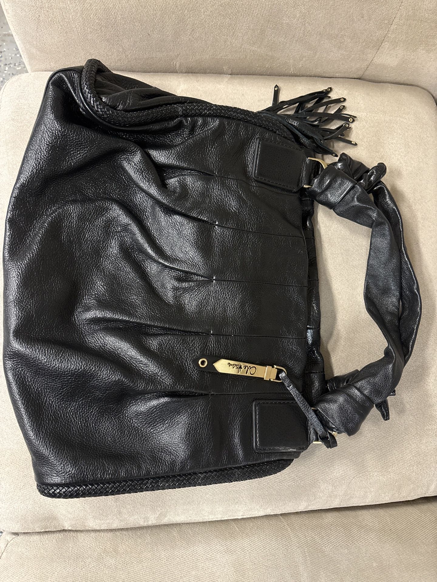 This black leather hobo handbag is from Cole Haan. It features a textured leather body with braided accents on the sides and a decorative tassel detail. The bag has 2 shoulder strap and a zip-top closure. 19 inches wide bottom x 12 inches bottom to top