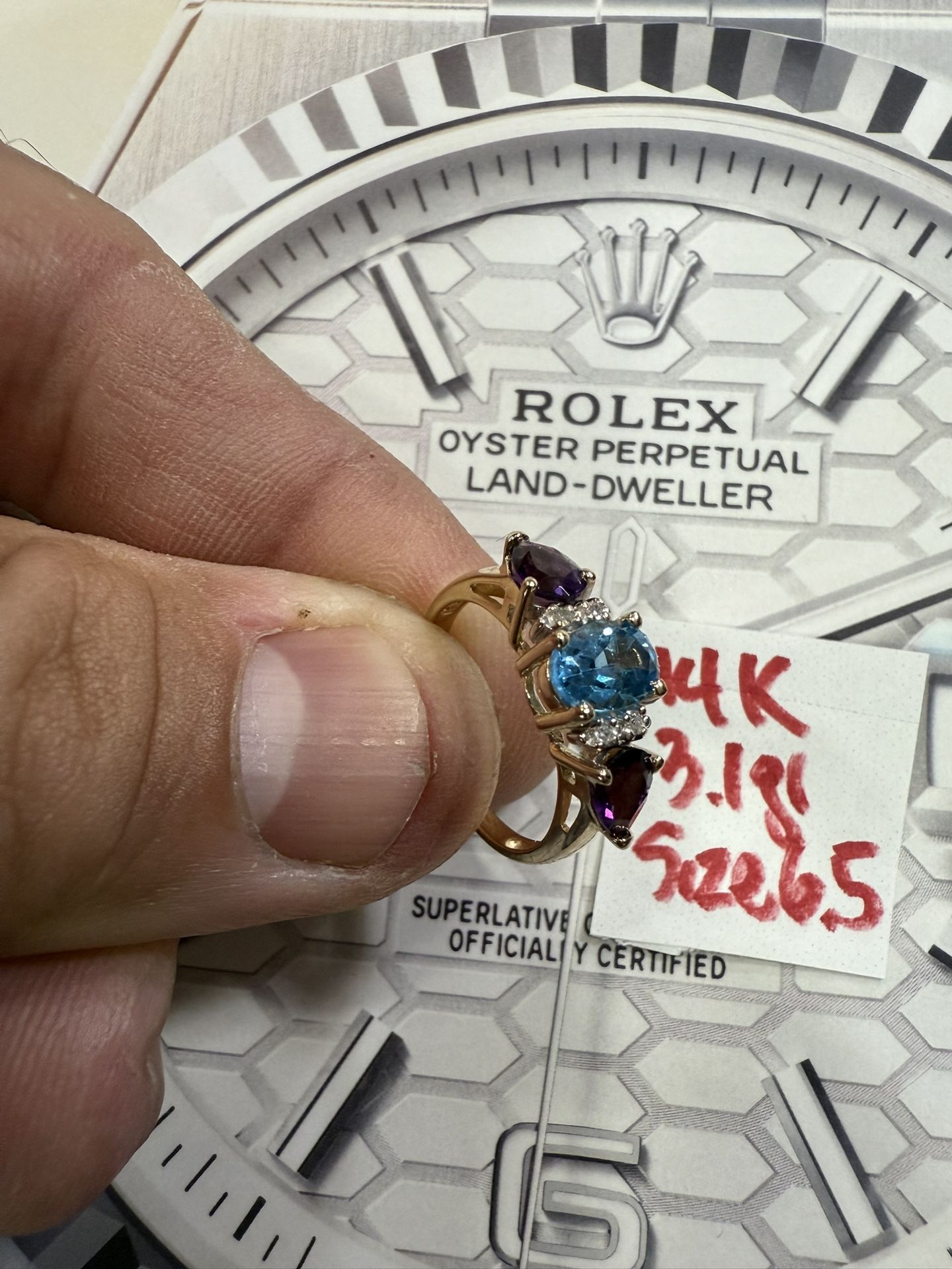 14K Solid Gold Wedding Ring TOPAZ AMATISTA AND DIAMONDS π STONES 3.1Gr Size 6.5