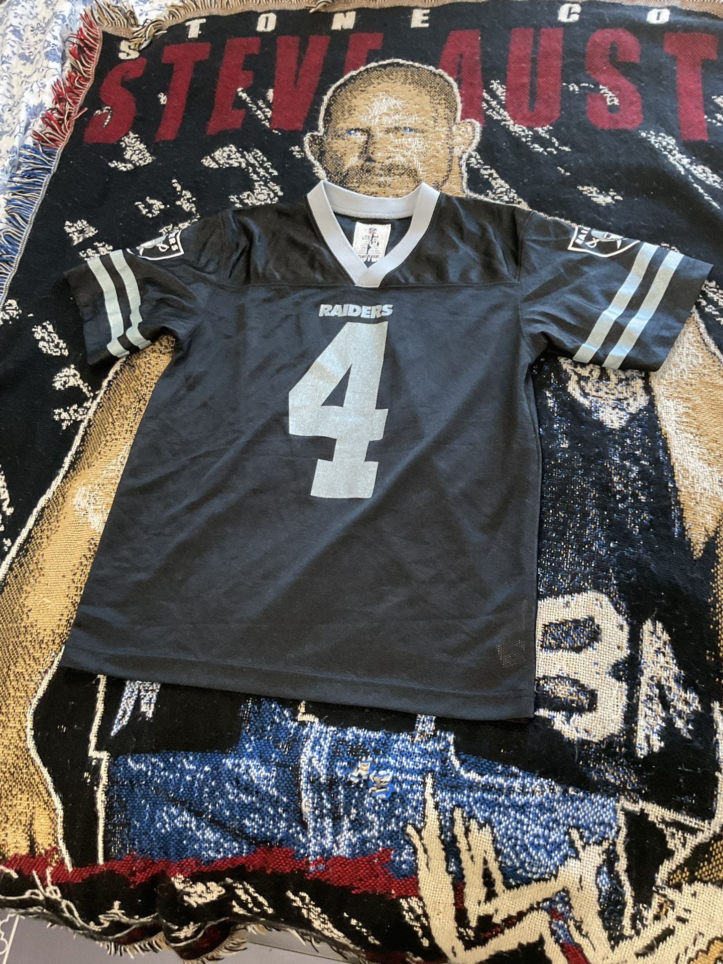 This Reebok football jersey features a striking black design with large white numbers prominently displayed on the front. The V-neck collar is accented with white trim, and the jersey is crafted from breathable mesh material, ideal for performance. Perfect for showcasing your team pride, this jersey combines style and functionality. NFL Oakland Raiders Derek carr jersey Reebok youth large would fit small adult 24” top to bottom 17” pit to pit