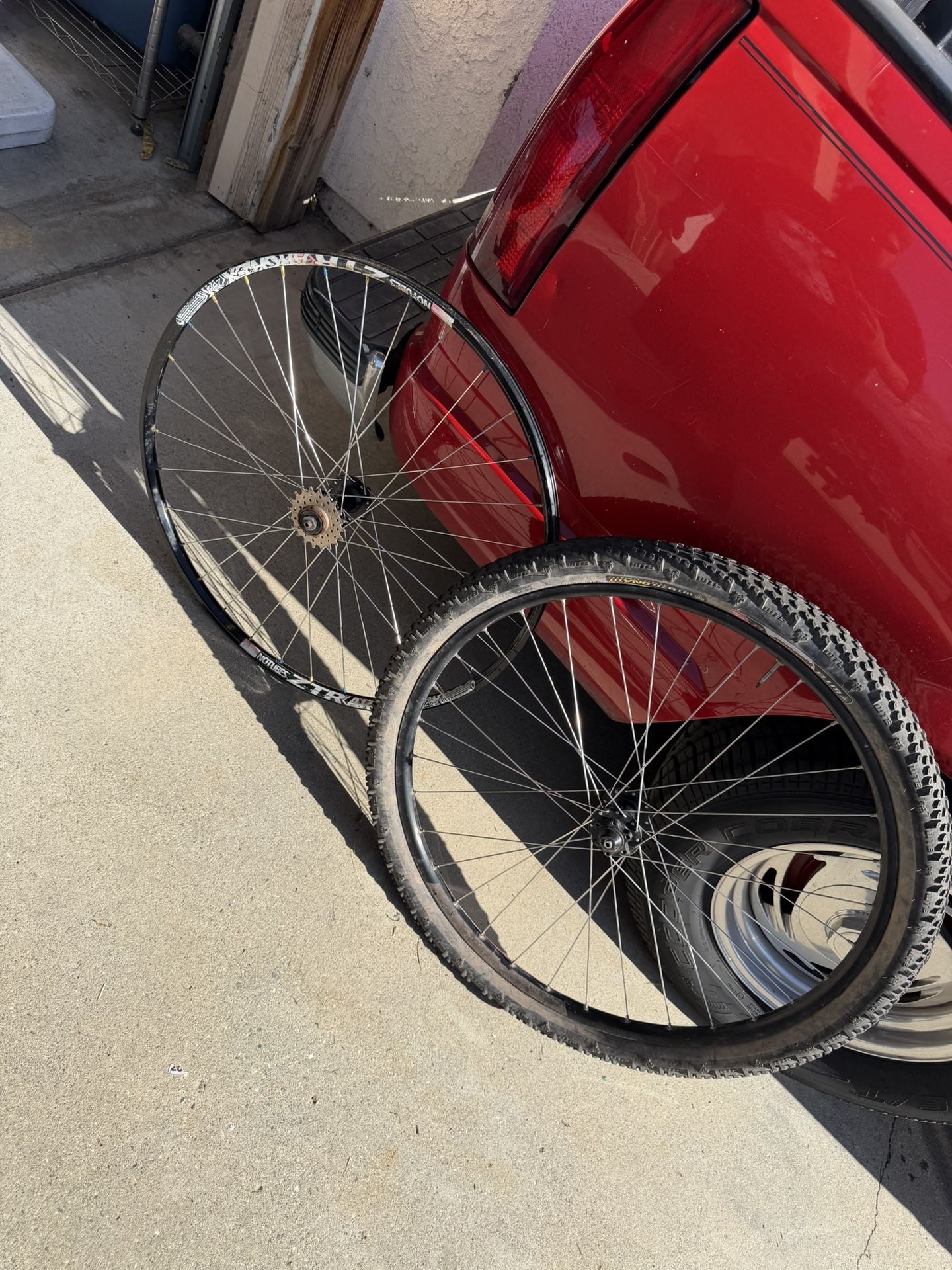 Redline 29” bicycle wheelset. Missing the axles. Come with one tire and tube as pictured. They work with disk brakes. Must pickup location on ad