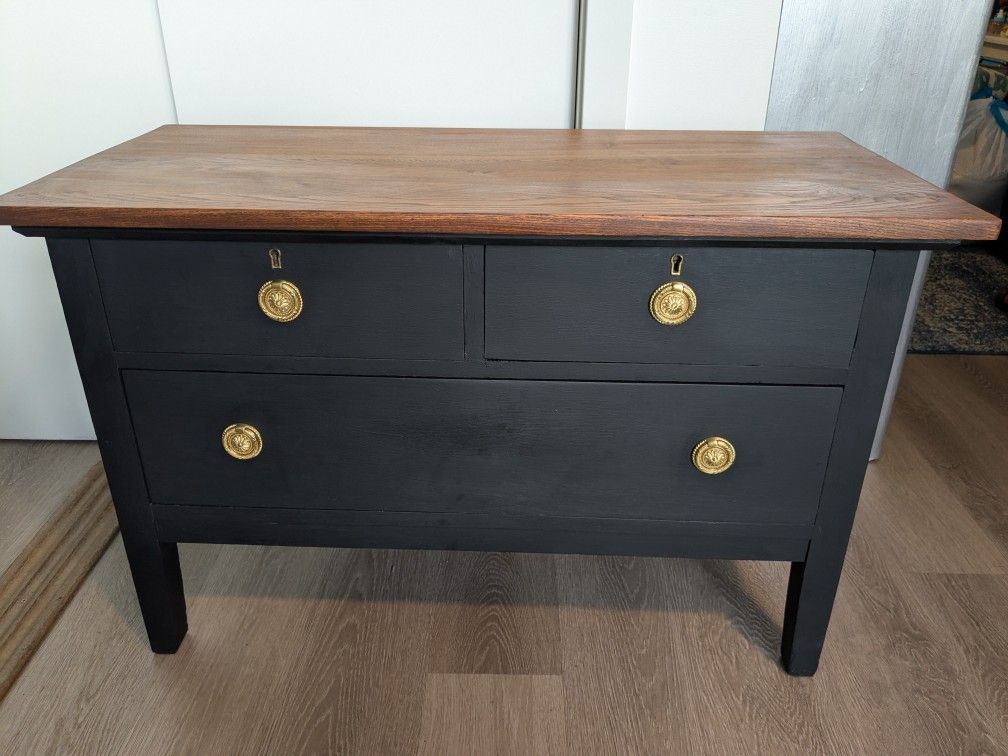 Stunning newly refinished 3 drawer antique dresser circa early 1900's. The top has been sanded and stained with an English Chestnut finish and sealed with a clear wax. The body of the dresser has been painted with a Black Onyx Chalk paint and is also sealed with a clear wax. The drawers are all functional and have been treated with a wood conditioner. The two small top drawers have been lined with vintage script and the bottom drawer has been lined with vintage music. New brass drawer pulls and original brass keyholes give this piece an elegant look. Solid Ash wood construction with dovetail drawers. This is a very sturdy, one of a kind dresser that would make a statement in any room. Dimensions: 38 1/4"W x 24 3/4"H x 18 3/4"D $269 OBO Pickup in Seattle on lower Queen Anne.