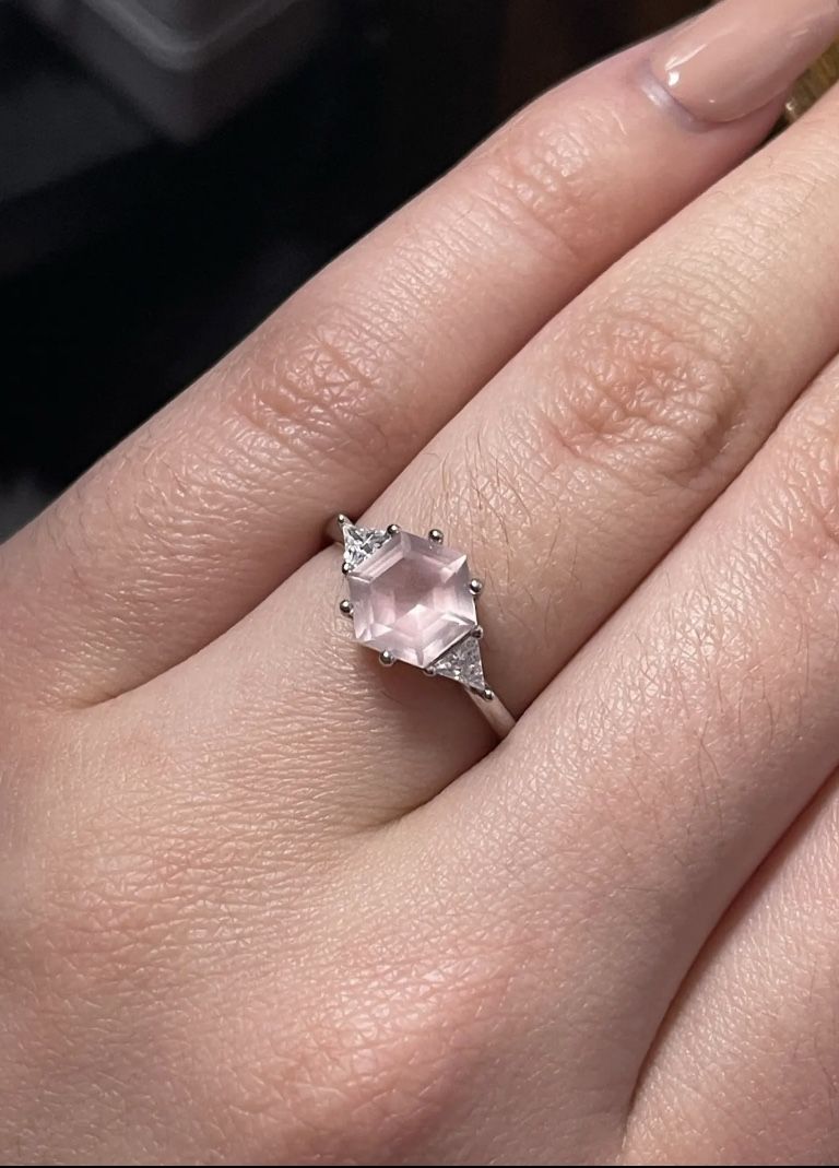 2ct Hexagon Cut Natural Rose Quartz with Trillion Cut Zircon White Rhodium Plated Solid Sterling Silver Ring, Stamped S925 is absolutely magnificent! Handmade Fine Jewelry Size 7 & 8 If you are interested in more than one of my items, I do bundle & ship together to reduce cost & fees