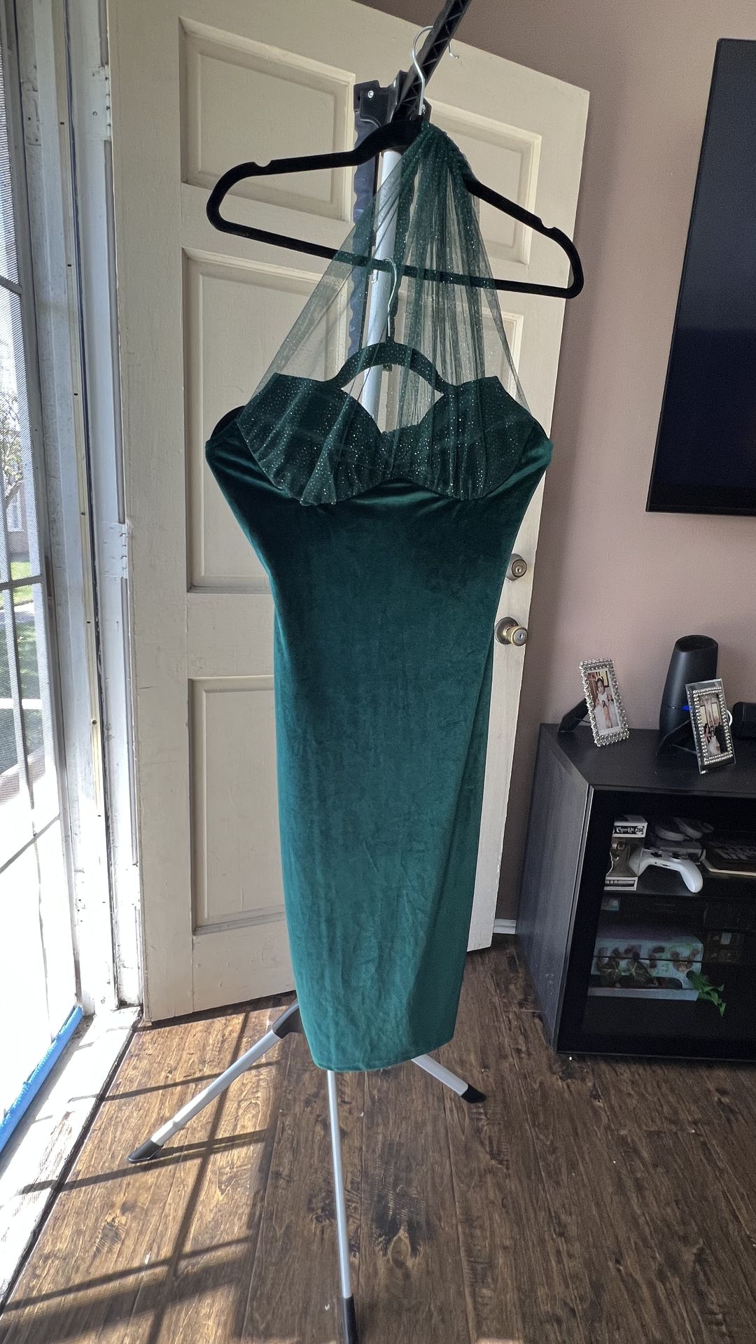Dark green dress. Stretchy. Small opening in the bottom back of the dress . The top mesh has some silver sparkles. Back zipper. Size XL . Brand new still with tags.