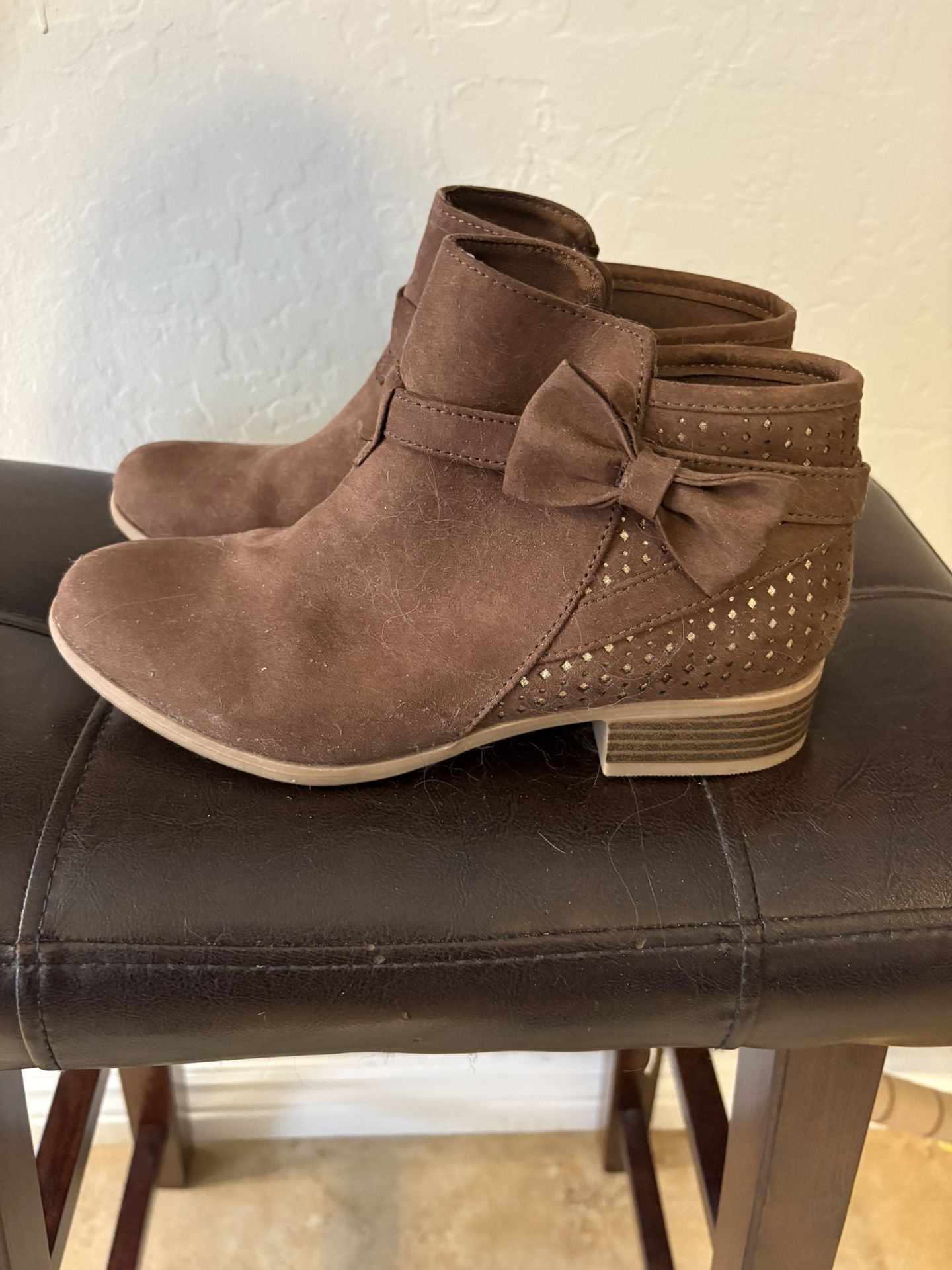Like new worn twice. Sz 5. Brown suede with gold embellishments.