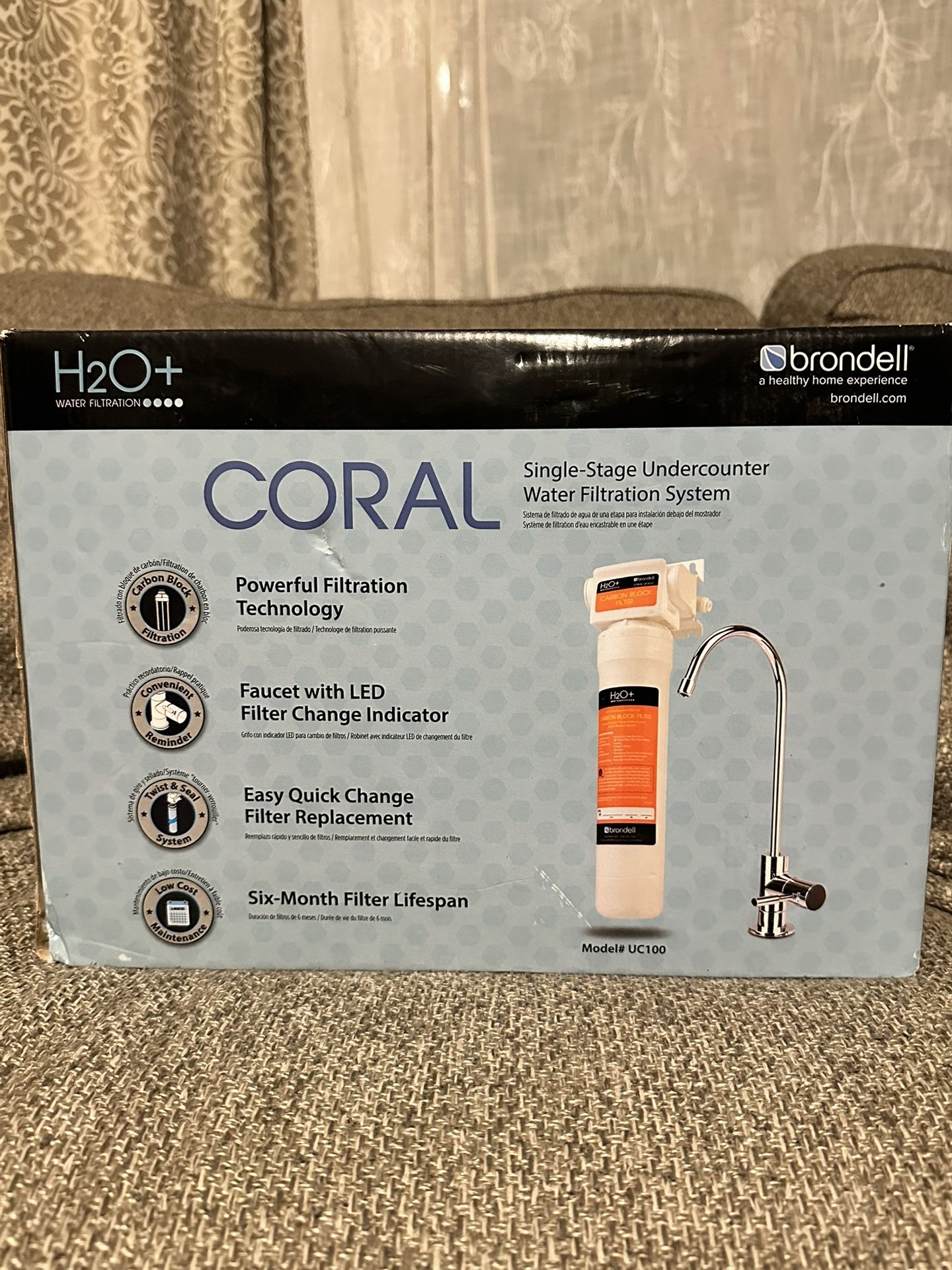 Brondell H2O+ Coral Single-Stage Undercounter Water Filtration System The Coral Single-Stage under counter water filtration system is a great solution for small households who want powerful water filtration in a small footprint. The Coral UC100 includes an elegant, designer chrome faucet with an integrated LED filter change indicator that reminds you when it's time to change the filter. The Coral UC100 system is tested and certified by WQA (Water Quality Association) to NSF/ANSI standards 42 and 53 for the reduction of Chlorine, taste and odor, Chloramine, Particulate Class | Particles, Cysts, Mercury, Lead, MTBE, Turbidity, Asbestos, and a full list of VOCs (see our Performance Data Sheet for the full list of contaminates reduced). The system has also been tested and certified by WQA according to NSF/ANSI 372 (low lead compliance) and CSA B483.1 (Canadian requirements). • Powerful certified carbon block filtration performance certified for more than 99% lead reduction • Designer chrome faucet with integrated LED filter change indicator (included) • Twist and Seal filter makes replacement a breeze • Double o-ring filter seal to prevent leaks • Six-month filter life (300 gallon capacity) • Low cost maintenance • Certified for NSF/ANSI Standards 42, 53, and 372 and CSA B483.1 • Gold Seal certified by WQA (Water Quality Association) for trusted performance • 1-year warranty • Proud members of 1% for the Planet. Brondell donates 1% of annual sales to environmental nonprofits.