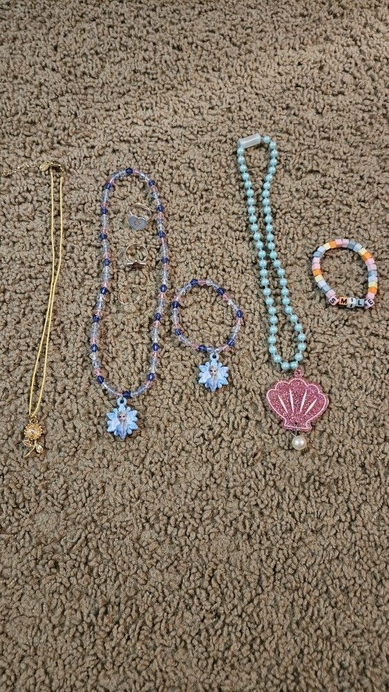Kids jewelry. Frozen set, 1 necklace, 1 bracelet, 3 rings $6 1 mermaid shell necklace $2 1 sunflower necklace $1 Smile bracelet $1 Will sell seperate