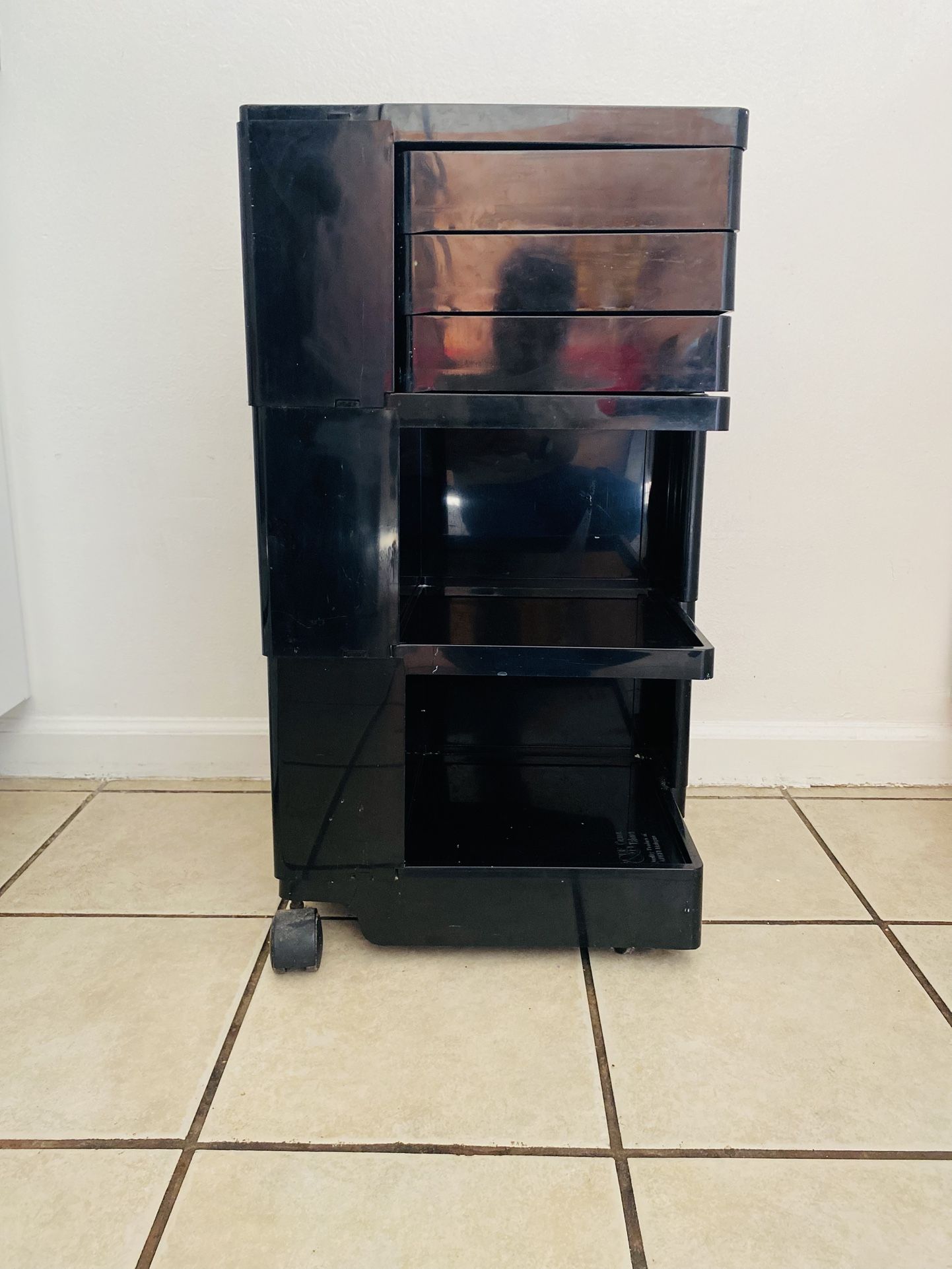 Solid vintage 1970’s black compartmentalization sturdy rolling art cart. The wheels are Cadillac smooth and the cart is made by a thick, moulded plastic that features sliding trays, cubbies and storage for longer items like rolled paper/plans/rulers at the top. Inspired by the famous designer Bobby by Joe Colombo. It’s perfect for Christmas wrapping art supplies or hair styling supplies. Dimensions are 16”W x 16.75”D x 29”H. Overall it rolls smoothly. All pieces are intact. Trays slide in and out. Light scuffs. Authentic and has the brand embossed on the bottom of the cart.