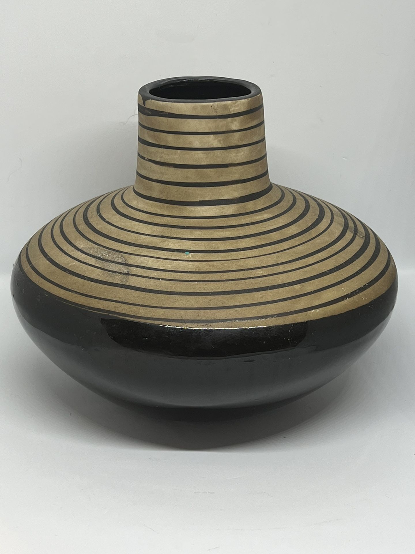 VTG TRIBAL 7”x10” POTTERY ART VASE, BLACK AND TAN SWIRL/UNMARKED RARE 7”x10”x10”