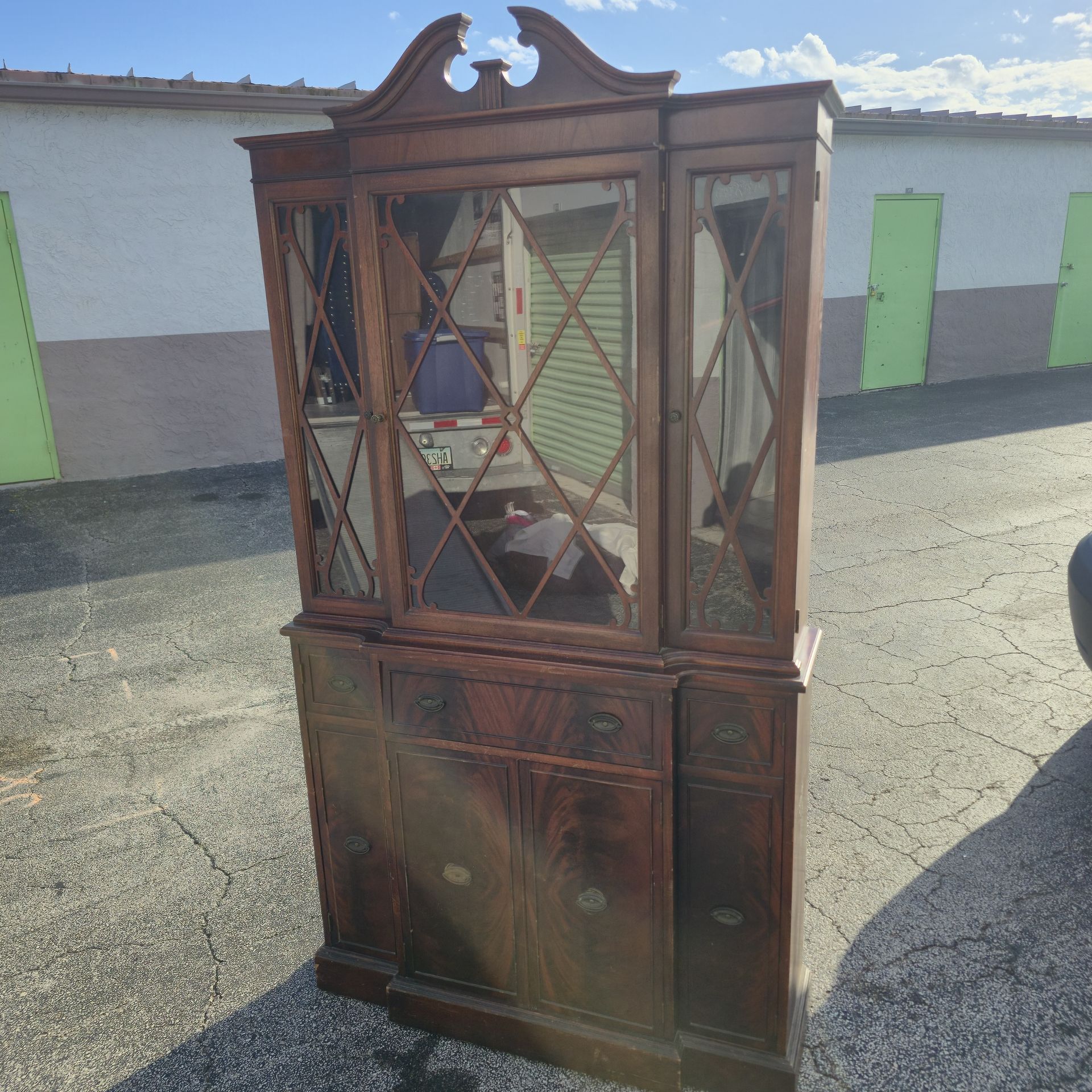 Vintage Ebert Mahogany Secretary & China Hutch Beautiful mid-century flame mahogany breakfront made by Ebert Furniture Co. (Red Lion, PA). Features a pull-down secretary desk, glass display doors with decorative wood lattice, and ample lower storage. Perfect for a home office or dining room. Style: Colonial Revival Details: Swan-neck pediment, original brass hardware, and elegant wood grain. Condition: Good vintage condition with minor surface wear consistent with age. Price: $450 OBO