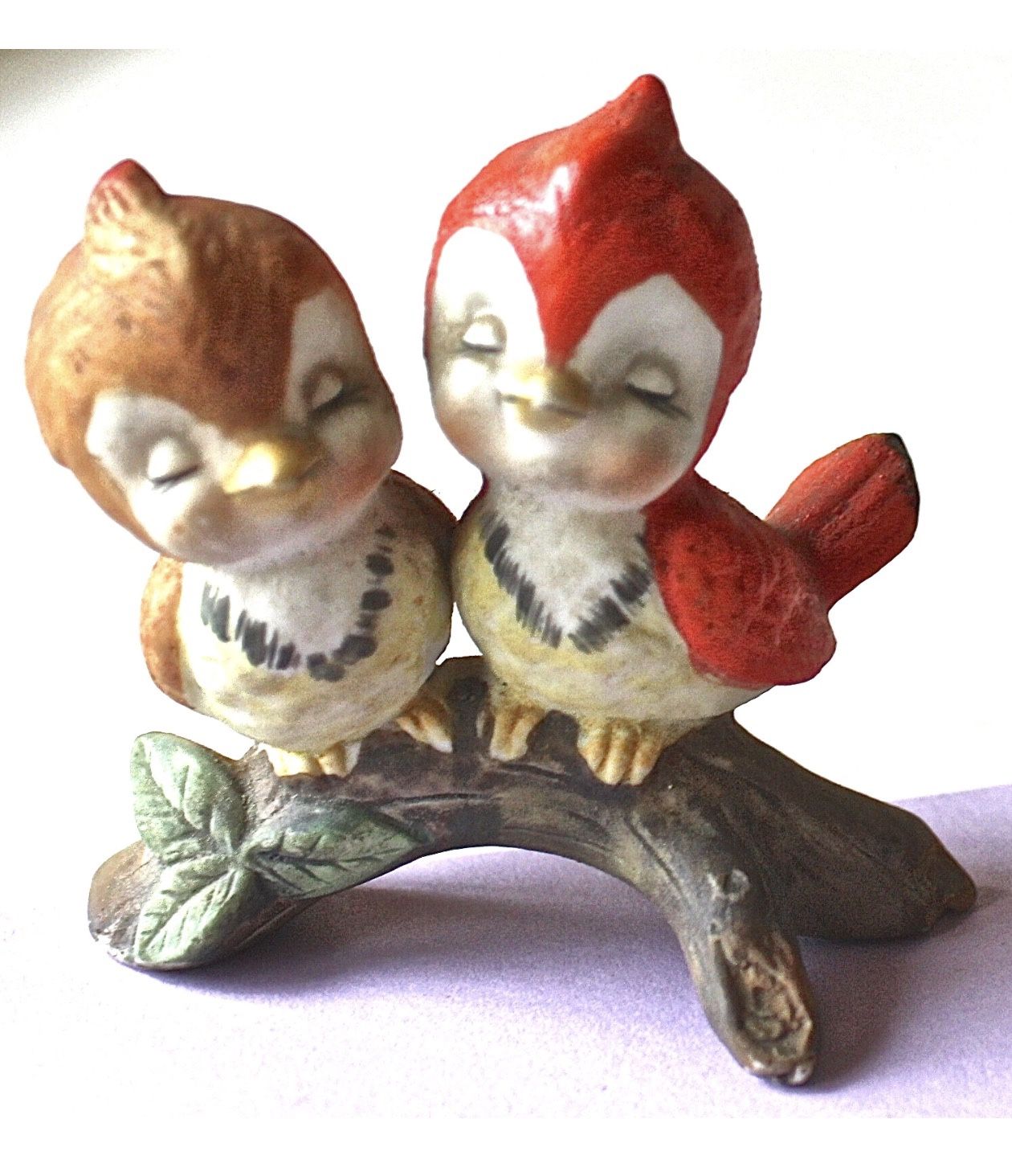 Vintage Anthropomorphic Lovebird Couple Ceramic Figurine with "Made in Taiwan" sticker. Approximate measurements 2 1/2" tall and 2 1/2"across. An Adorable Vintage Figurine in Great Preowned Condition with No damage or signs of repair,