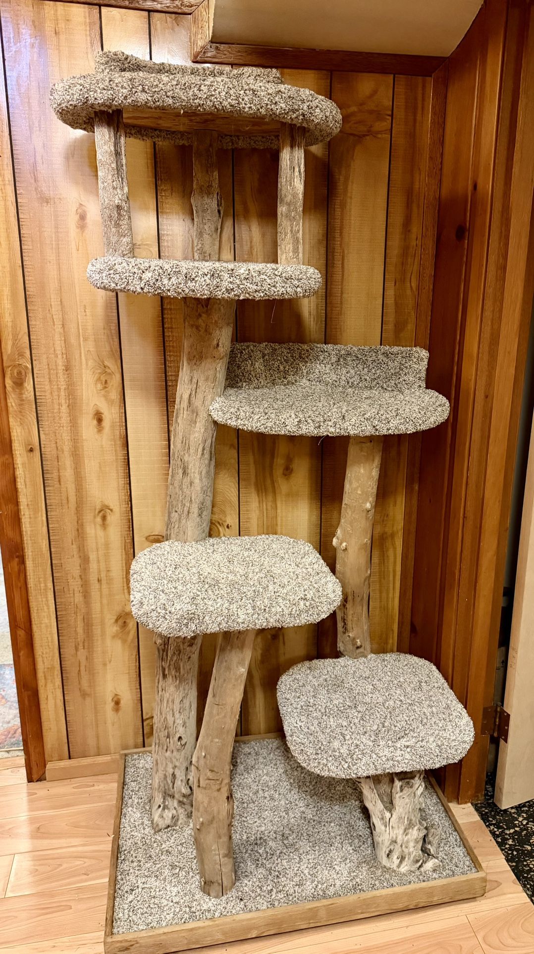 Original price was $500 (+ tax) This beautiful cat tree was handmade by Eastern Washington small business ‘Scratch n Sniff’! We have 2 of them and the cats use the one upstairs regularly, but this one mostly gets ignored by them since they’re too cool to hang out in the basement most of the time 😆 there are some light cat scratches on some parts of the driftwood, but you can’t really notice unless you’re looking closely. This is built very sturdy and well made, and I’m sure will last a really long time. It is also quite large- the base is approx. 23”x33” and is 70” from the floor to the tallest part. In very good condition and any fancy kitty would appreciate the quality and workmanship of this fine piece of furniture! **We can deliver if a reasonable distance (15 miles or so)