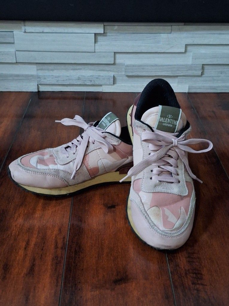 Valentino Garavani Pink Camo Rockrunner Rockstud Sneakers Low Top Athletic 38 , US size 8. Pre-loved, in good overall condition. There are some scuffs on the front and some slight discoloration in a spot as shown in the photos. Please see photos for wear.