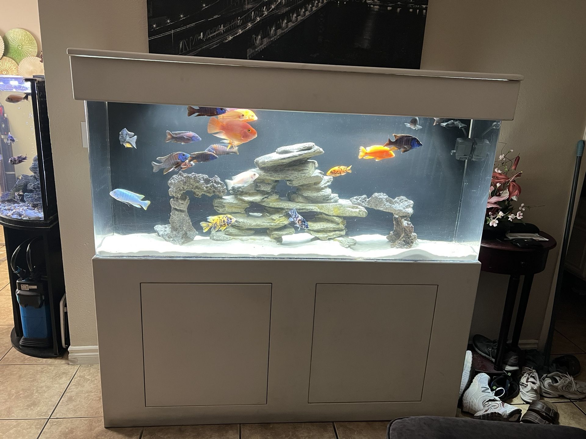 Selling my 125 acrylic fish tank with filtration built-in , heater sand decoration 2 programmable Bluetooth lights it’s a complete set. Measurements 60 “L X 18”W X 24”H