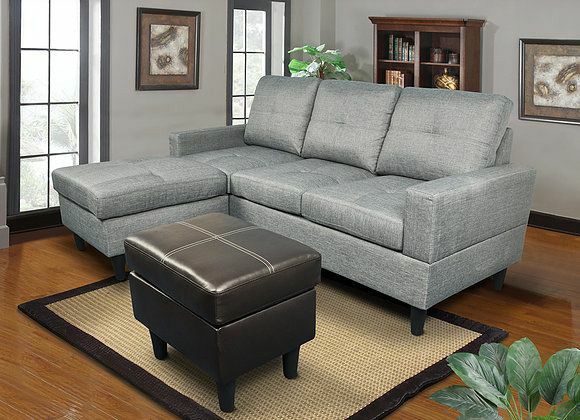Brand New Gray Denim Linen Fabric Sectional With A Reversible Chaise & Footrest