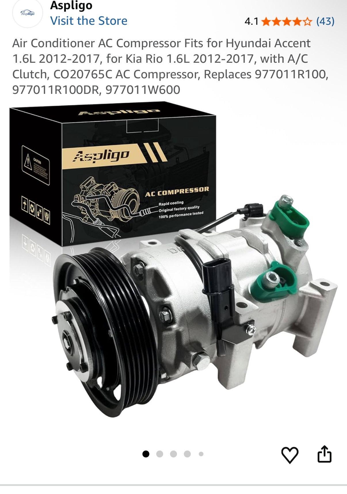 Brand New Air Conditioner AC Compressor Fits for Hyundai Accent 1.6L 2012-2017, for Kia Rio 1.6L 2012-2017, with A/C Clutch, CO20765C AC Compressor, Replaces 977011R100, 977011R100DR, 977011W600 Retail: $125 Asking: $75 OBO