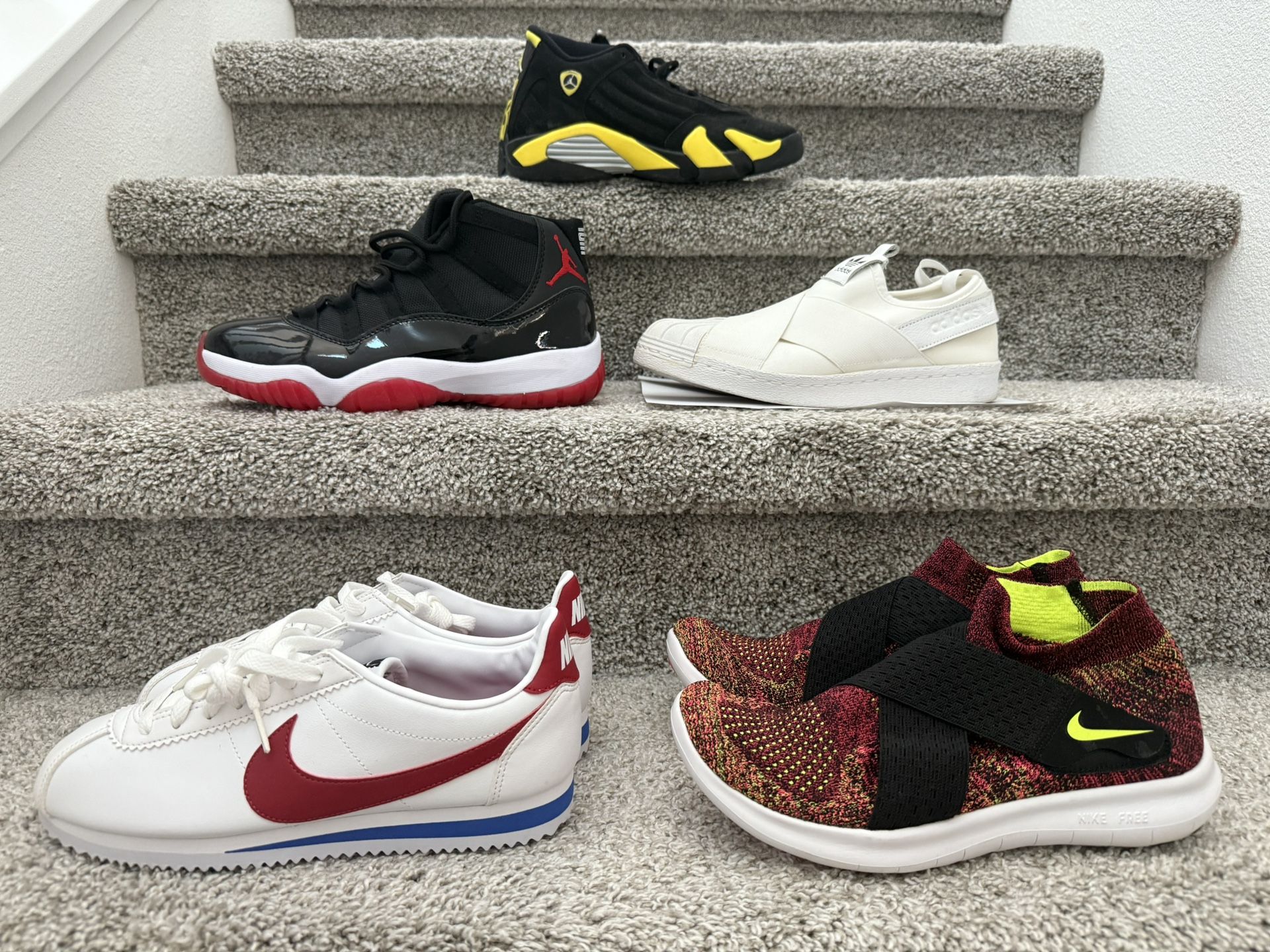 (everything doesn't have a box, thrown away when we moved) AJ 11 bred - new/ size US 7 men - $150. AJ 14 thunder - used once. size 6Y - $150. adidas superstar slip-on - used once. size 7.5 women. - $70. Nike cortez - new. size US 8 women. - $70 nike motion free run - new. size US 8 women- $100. pick up E lake mead and hollywood.