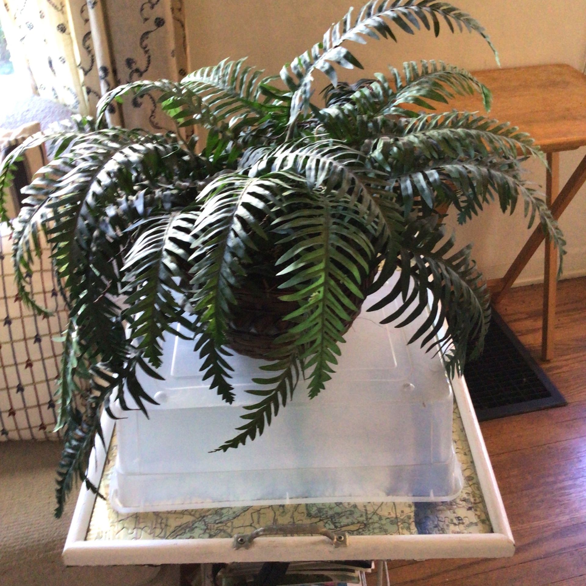 Pot with fake plant inside.